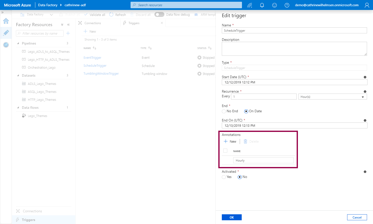 For linked services and triggers: In the configuration pane, click + add annotation, then add the annotation value: