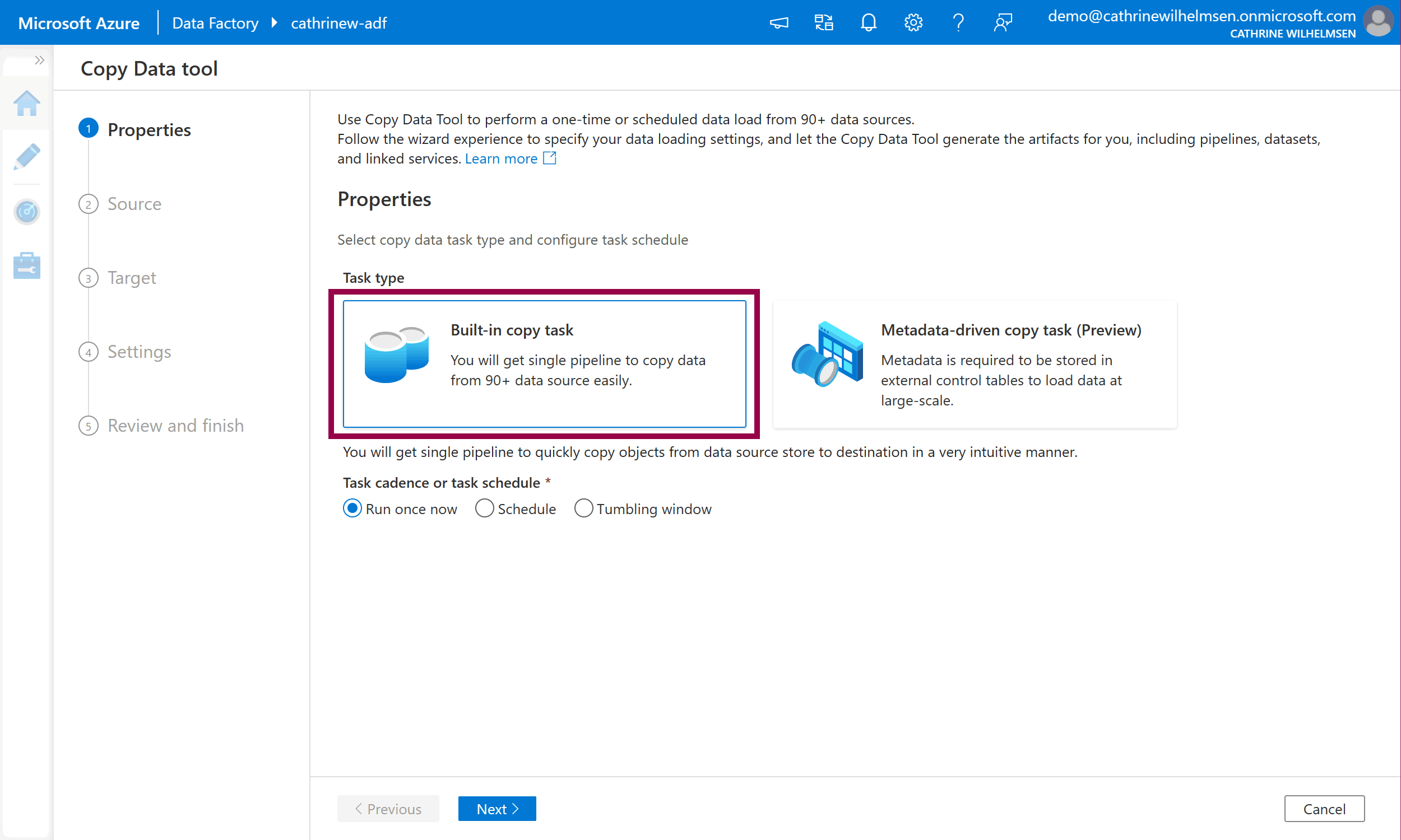 On the Properties page, choose the built-in copy task. This will create a single pipeline. (The other option, metadata-driven copy task, was released in July 2021. It will create a full, dynamic, metadata-driven framework. You may want to return to this after finishing this series, but for now we will start with a single pipeline.) Keep the default run once now option: