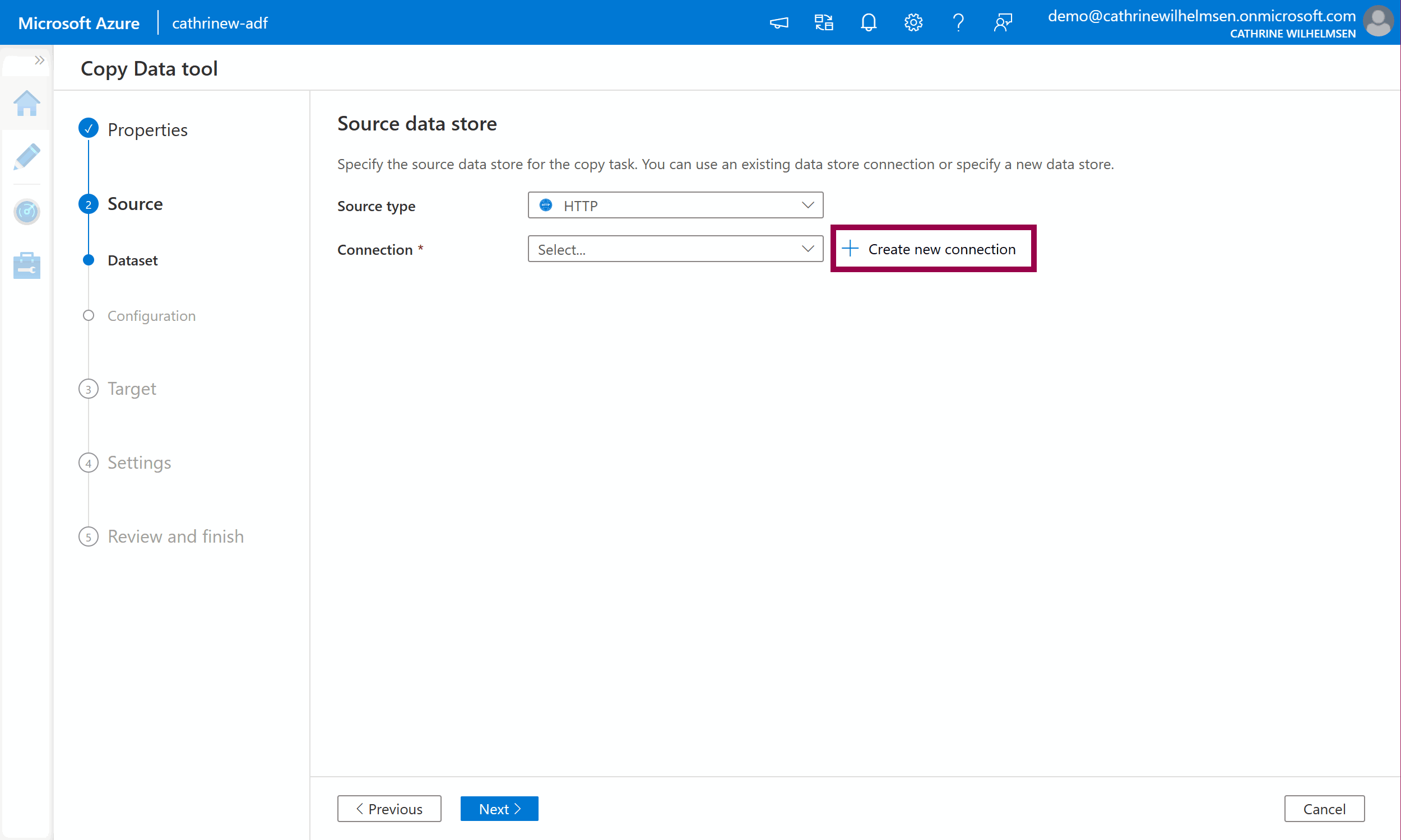 On the source dataset page, choose HTTP from the source type dropdown, then click create new connection: