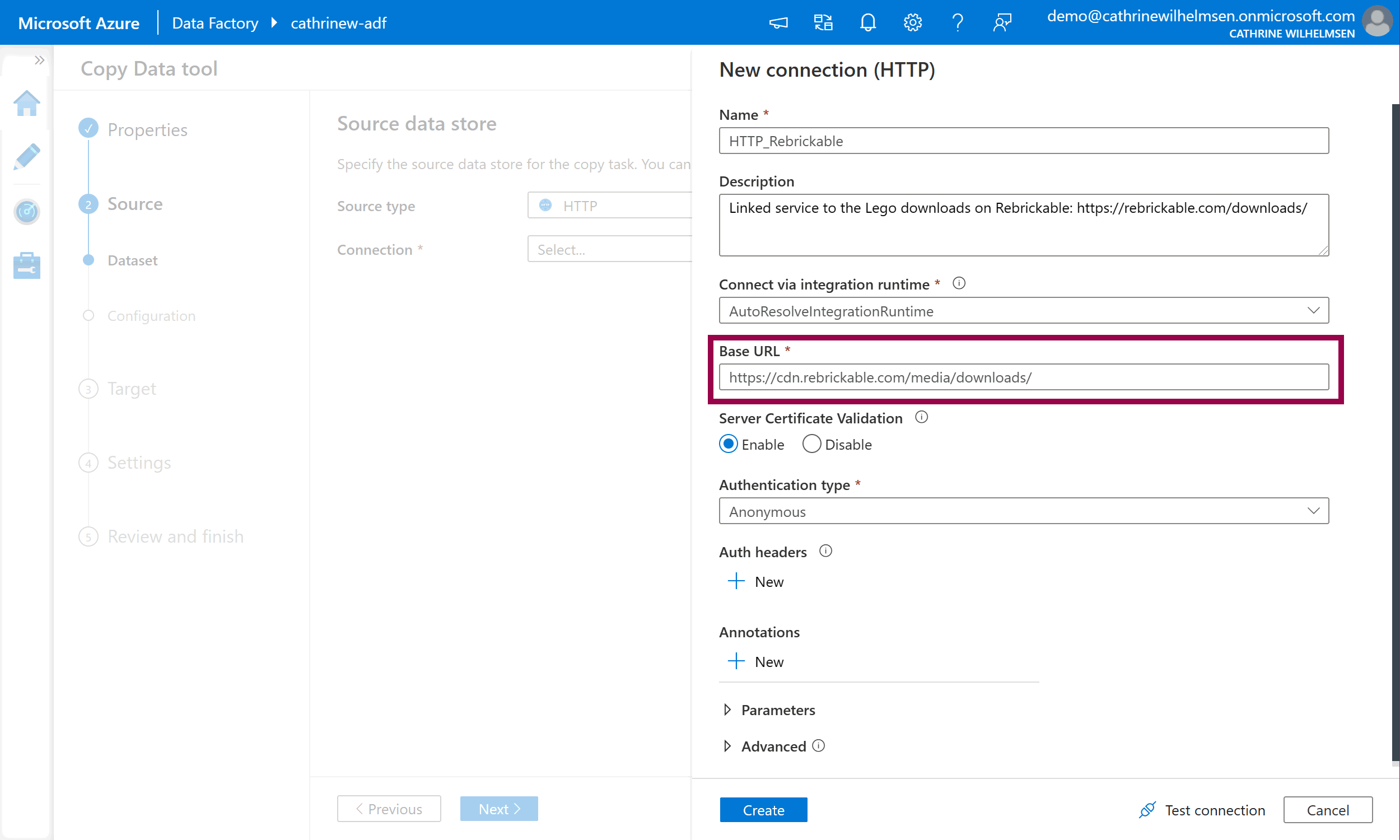Give the linked service a name and description, and use the base URL https://cdn.rebrickable.com/media/downloads/. (You can find this URL by inspecting the links on rebrickable.com/downloads. Keep the last slash.) Change authentication type to anonymous. Click create: