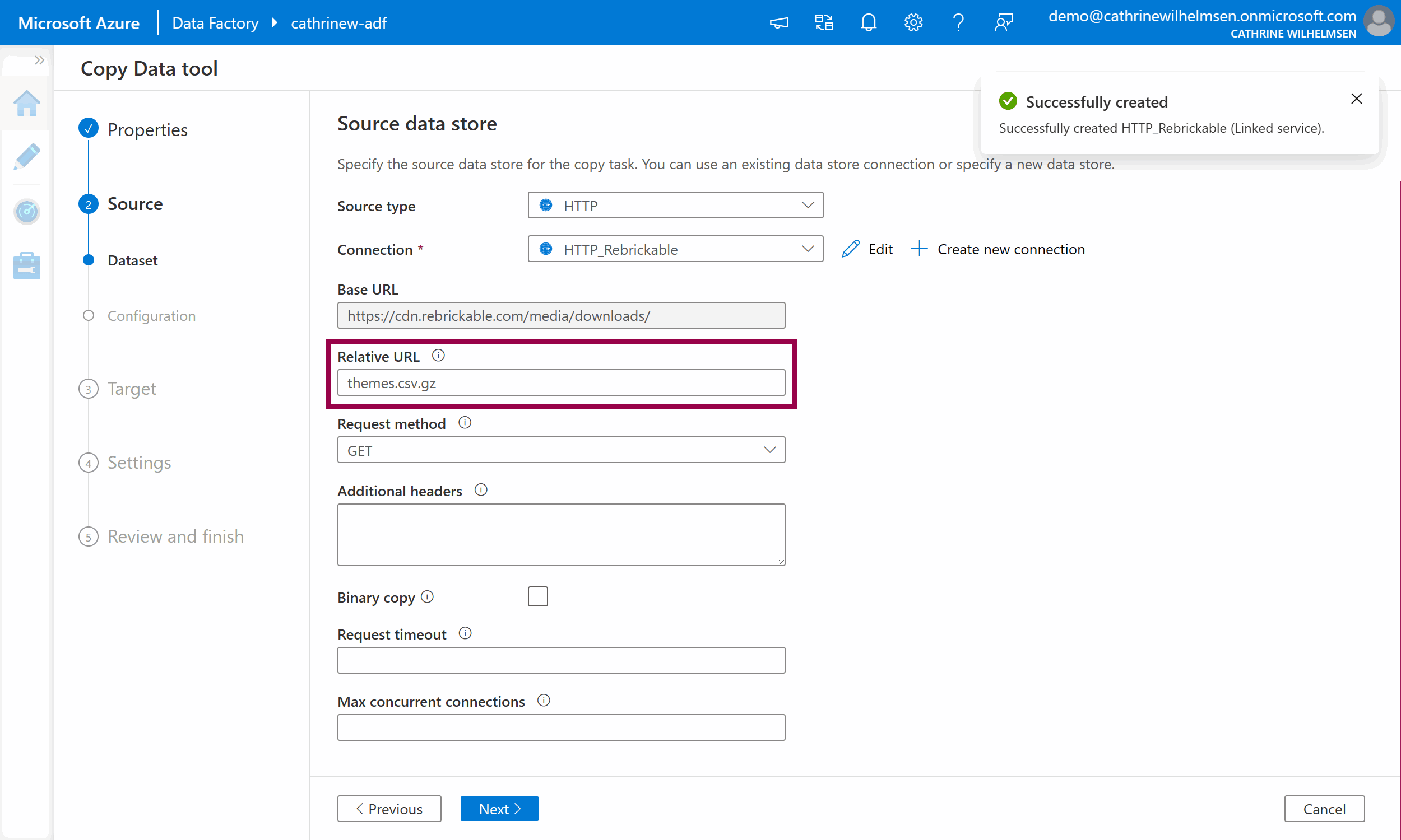 The linked service has now been created, yay! Since we specified the base URL in the Linked Service, we only have to specify the file name themes.csv.gz in the relative URL. Keep the other default options. Click next:
