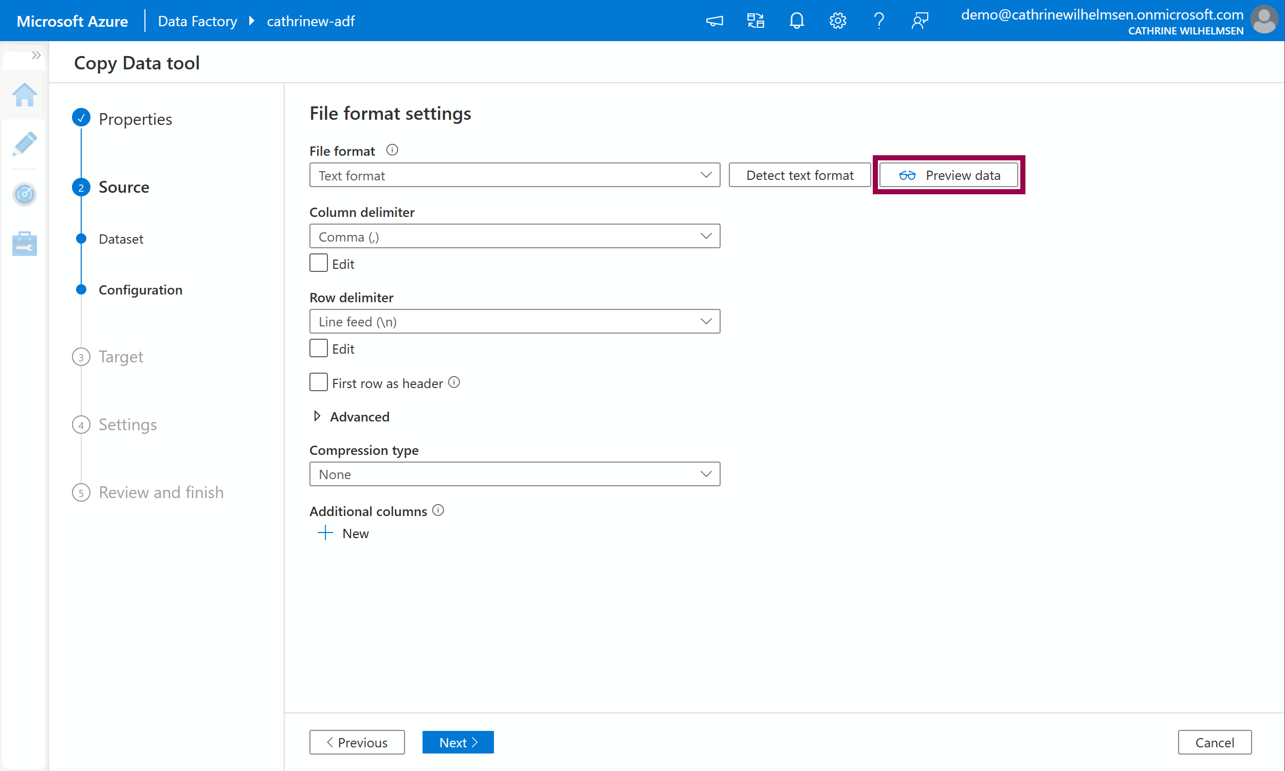 On the source configuration page, we have to specify the file format settings. We can click on detect text format and preview data, but at this point nothing really makes sense…