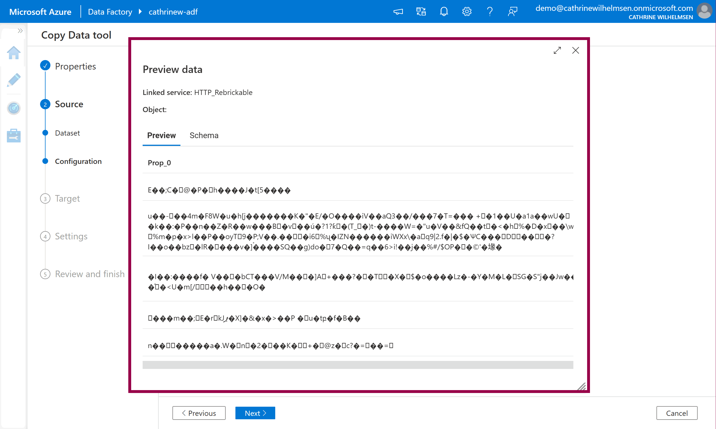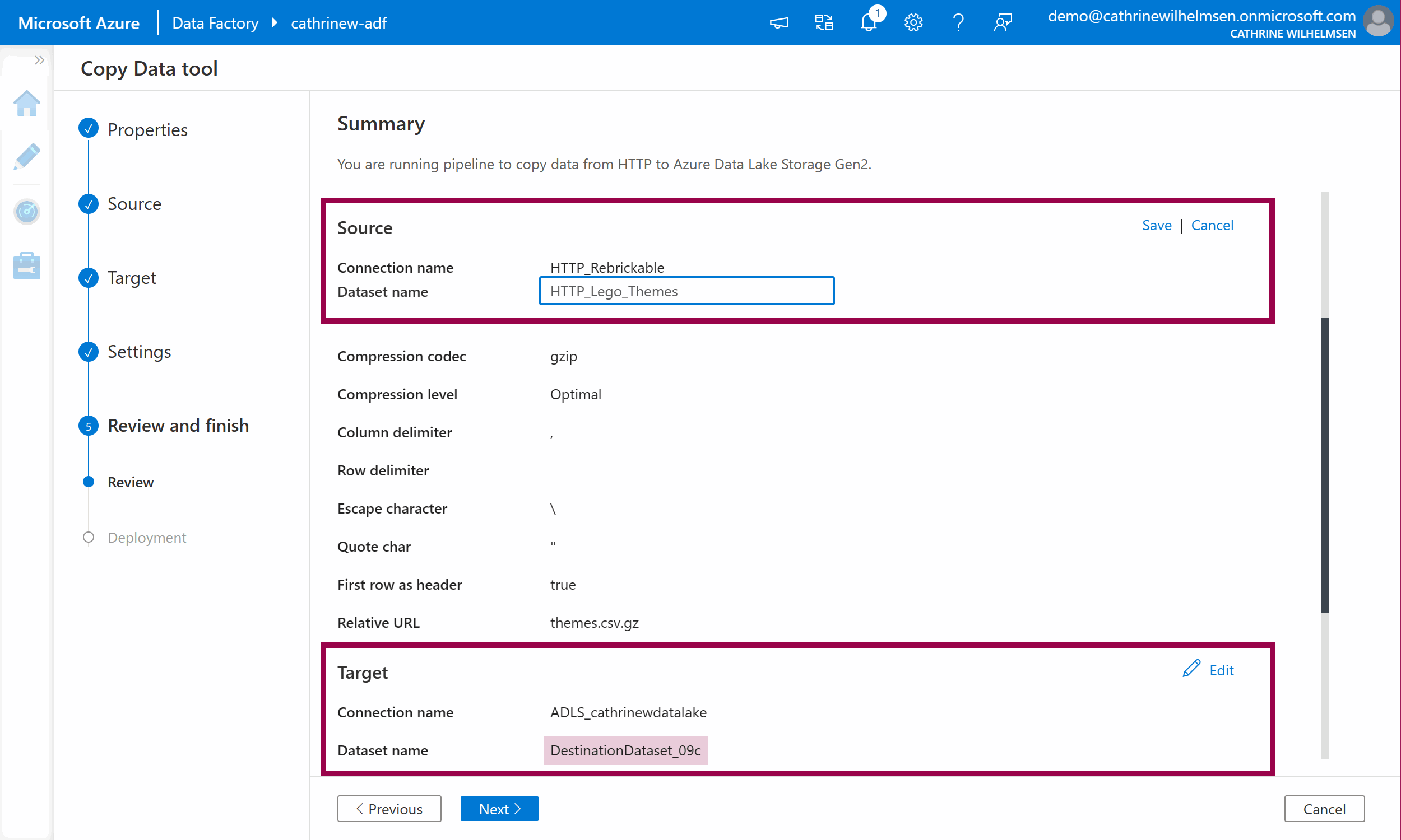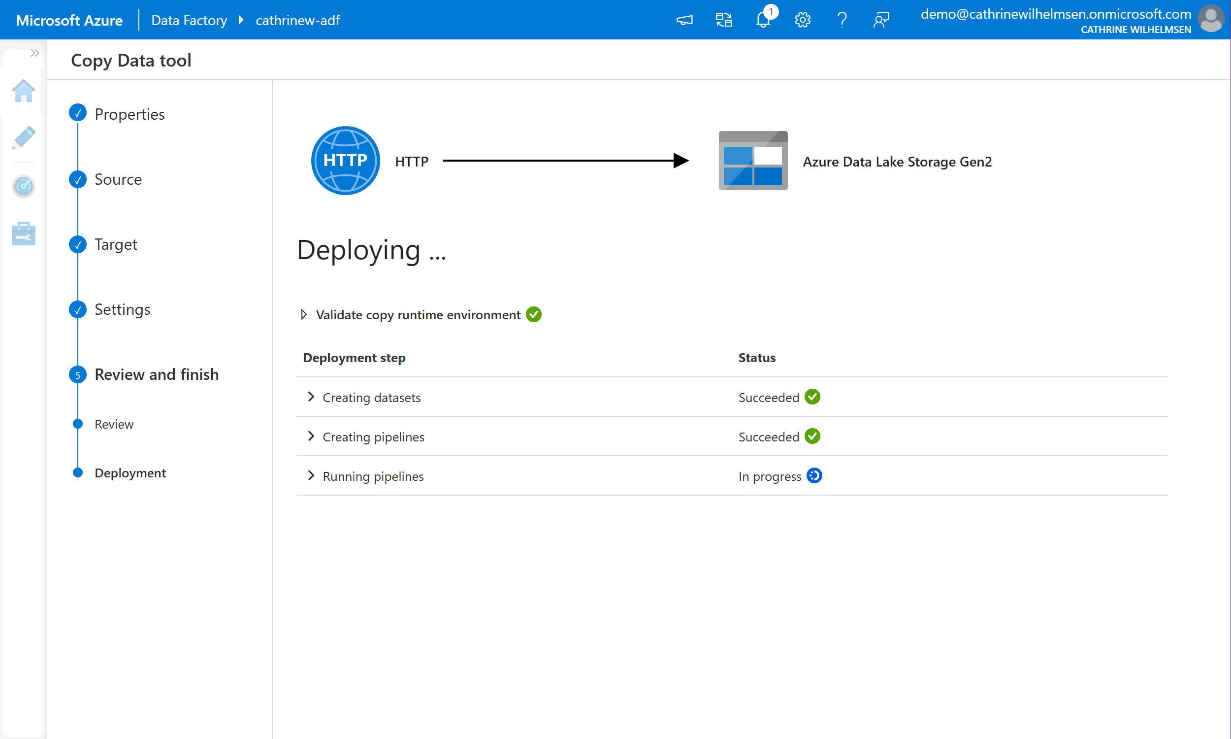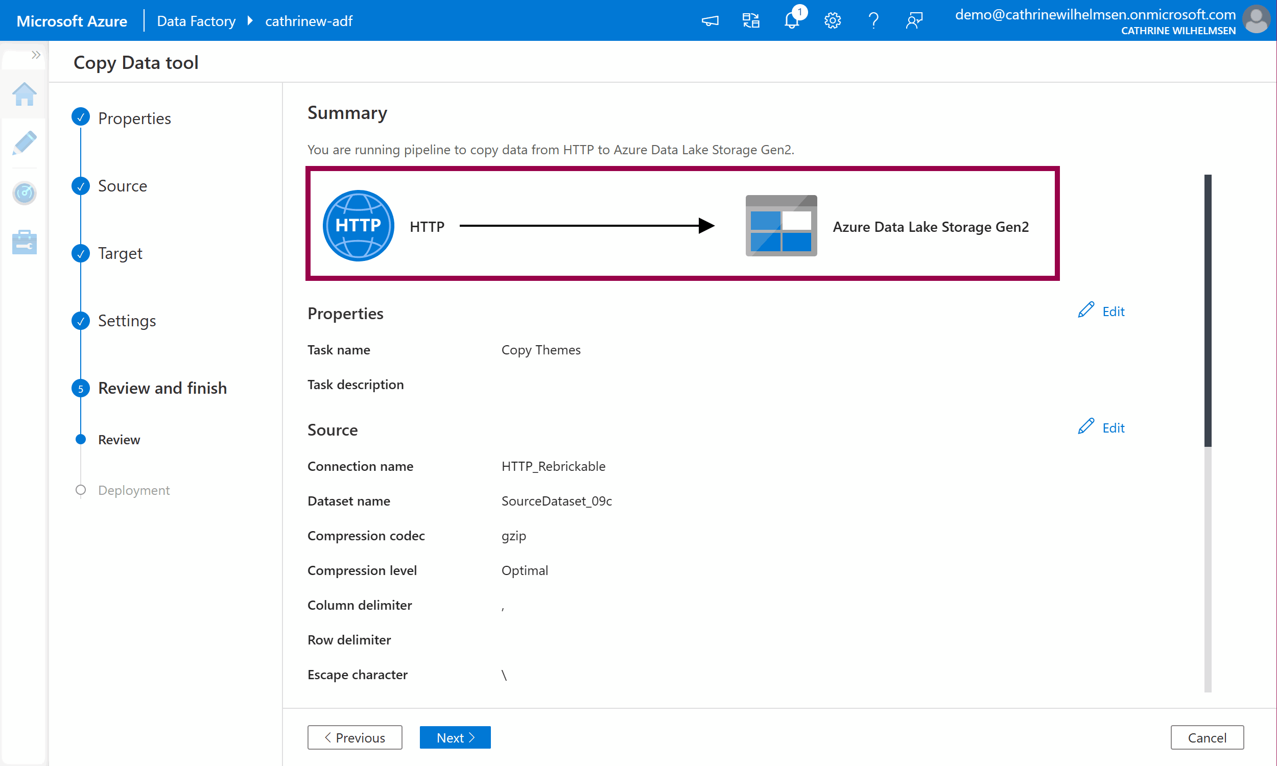 On the Review page, you will see a pretty graphic illustrating that you are copying data from an HTTP source to an Azure Data Lake Storage Gen2 target: