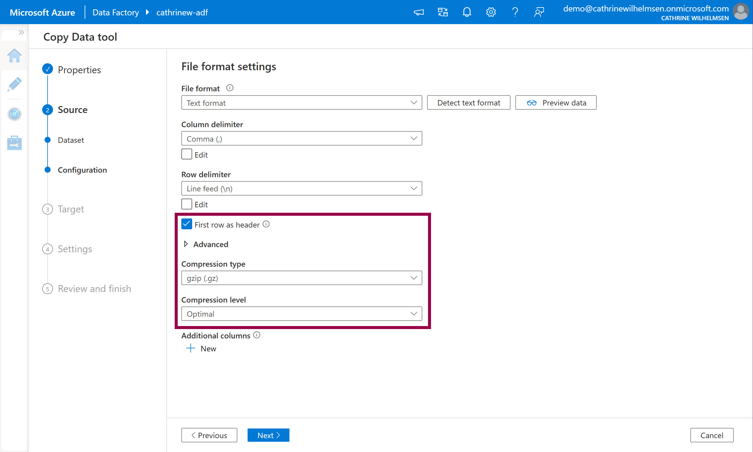 Let’s fix that! Select first row as header, change the compression type to gzip, and set the compression level to optimal. Click preview data again. Tadaaa! Magic! We can now preview the data inside the gzipped file without having to download or unzip it manually! Amazing 🤩