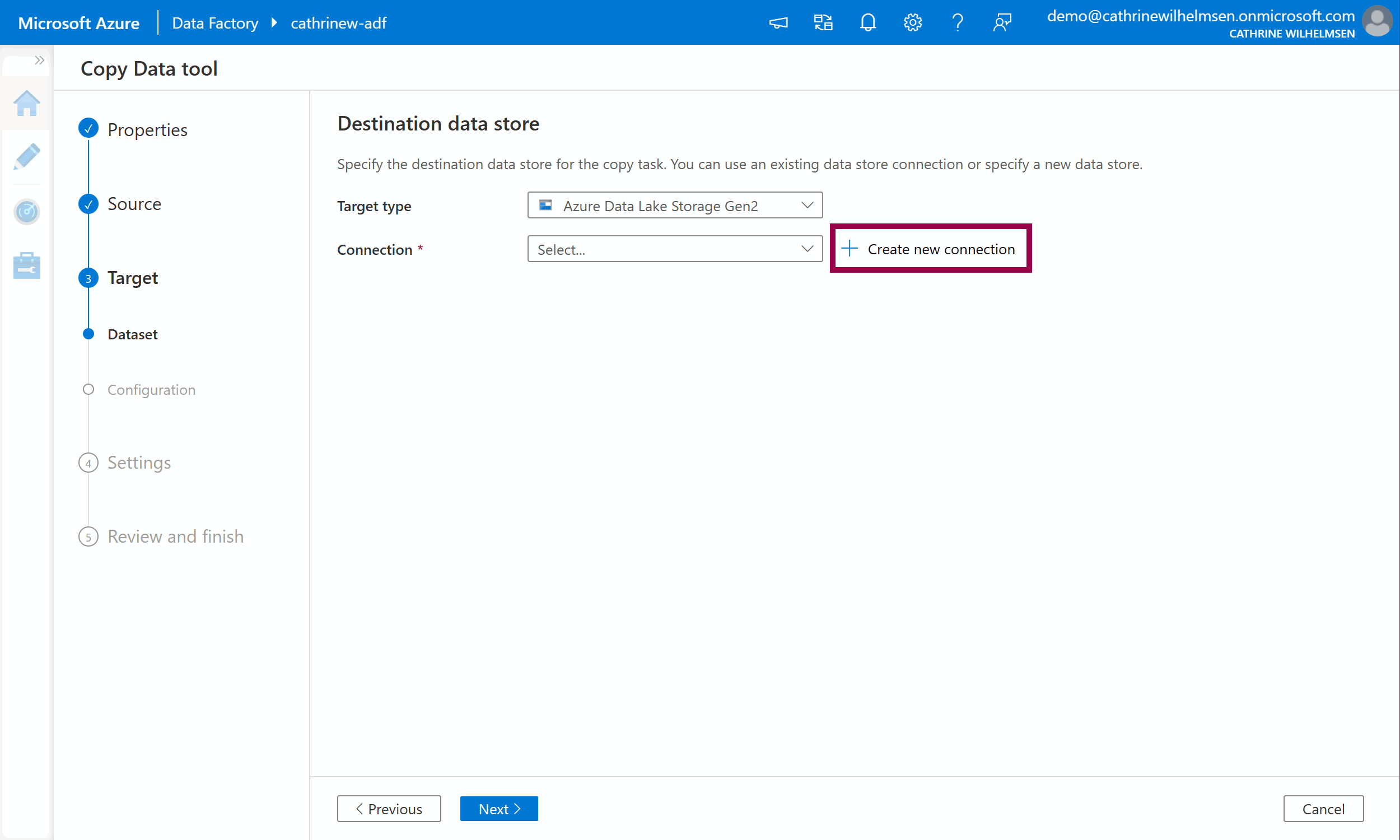On the target dataset page, choose Azure Data Lake Storage Gen2 from the target type dropdown, then click create new connection: