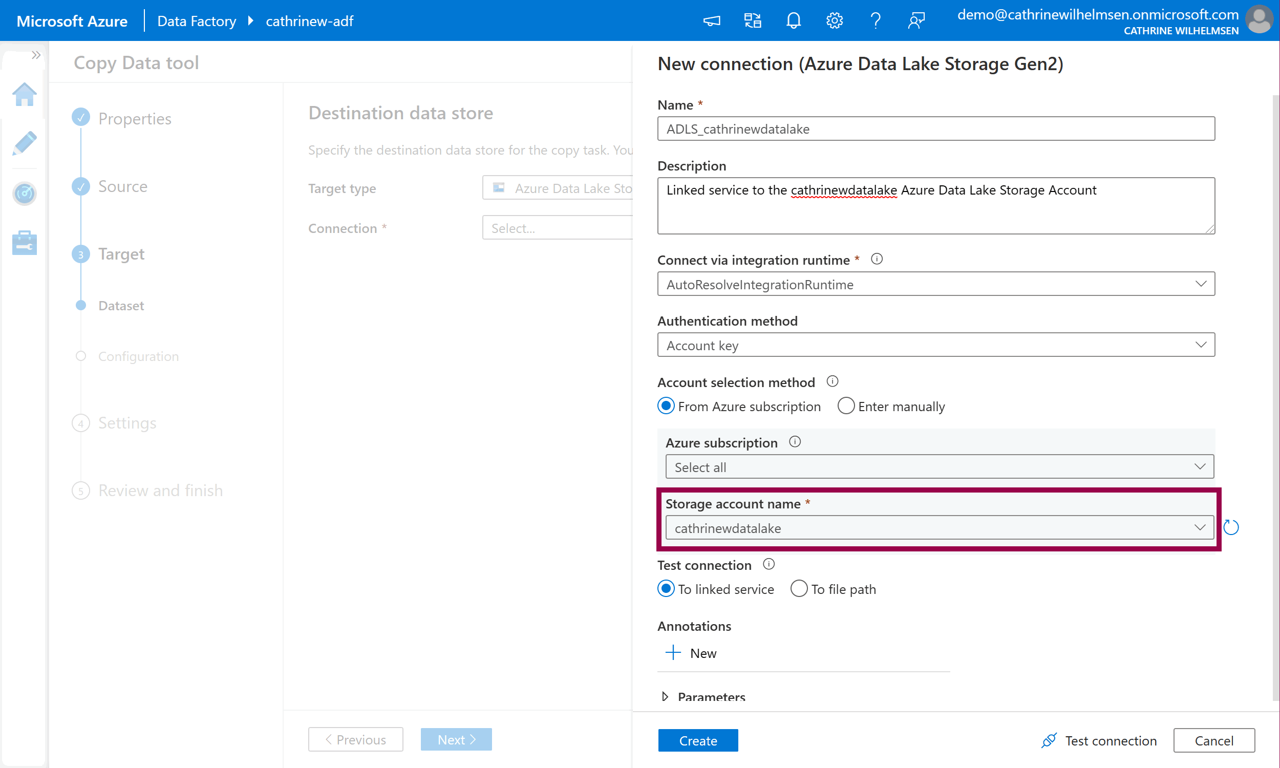I chose the name ADLS_cathrinewdatalake, because I like to prefix my linked services with the connection type.