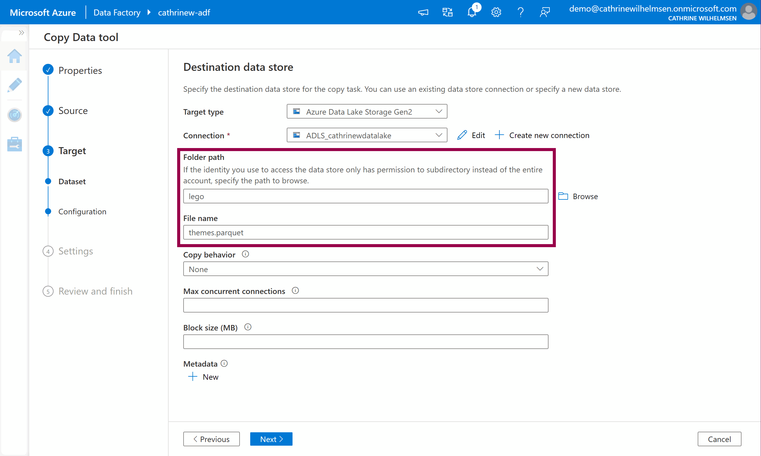 The second linked service has now been created, yay! Specify lego as the folder path, and themes.parquet as the file name. Keep the other default options. Click next: