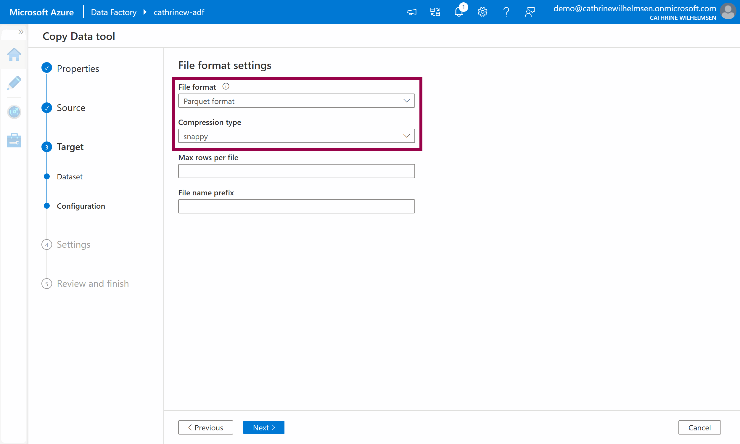 Verify that the file format is automatically set to Parquet after specifying .parquet as the file name in the previous step: