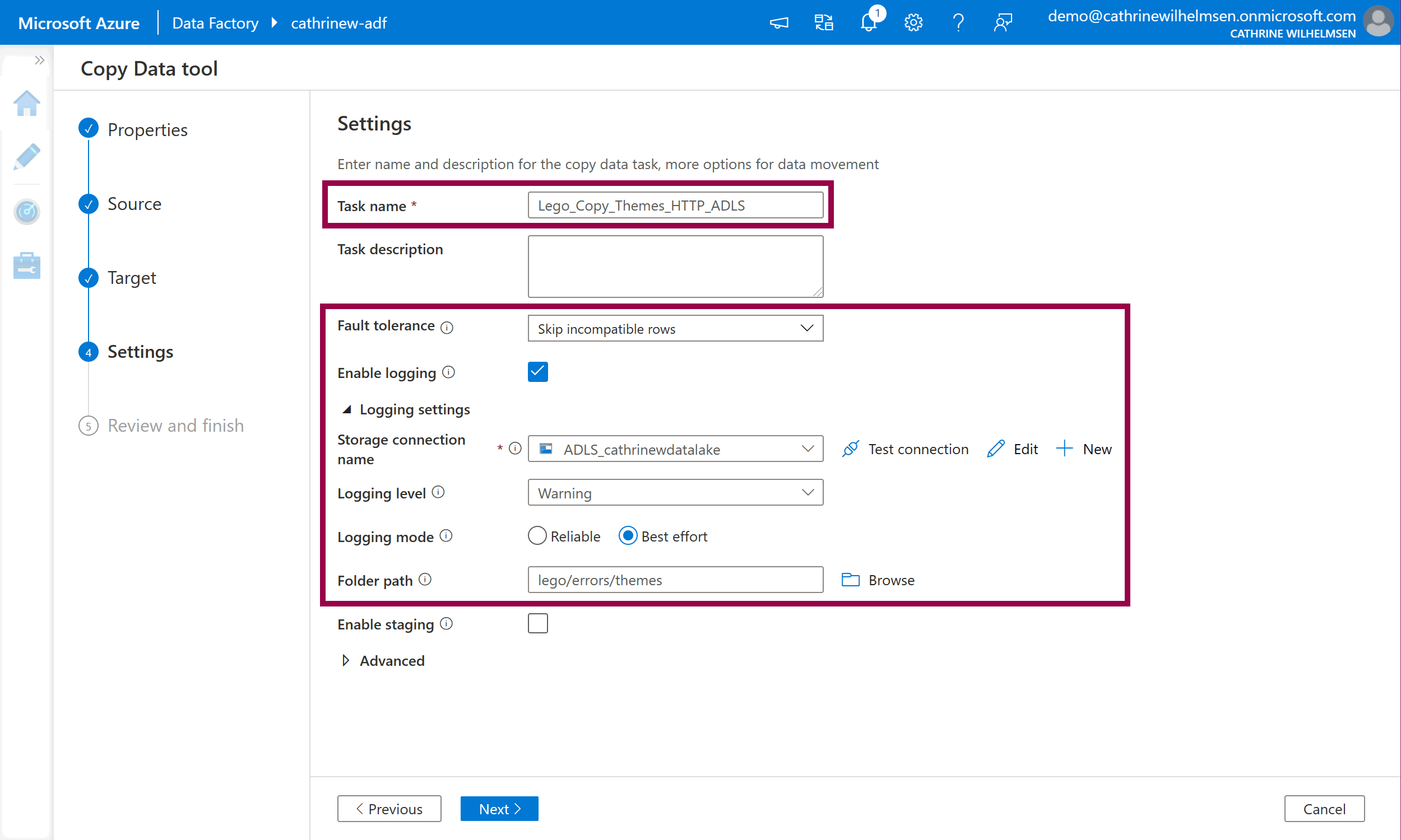 On the Settings page, we will name our pipeline and configure fault tolerance and logging settings. This is another part that feels like magic. By changing a setting, we can enable automatic handling and logging of rows with errors. Whaaat! 😁 In SQL Server Integration Services (SSIS), this had to be handled manually. In Azure Data Factory, you literally just enable it and specify the settings. MAGIC! 🥳