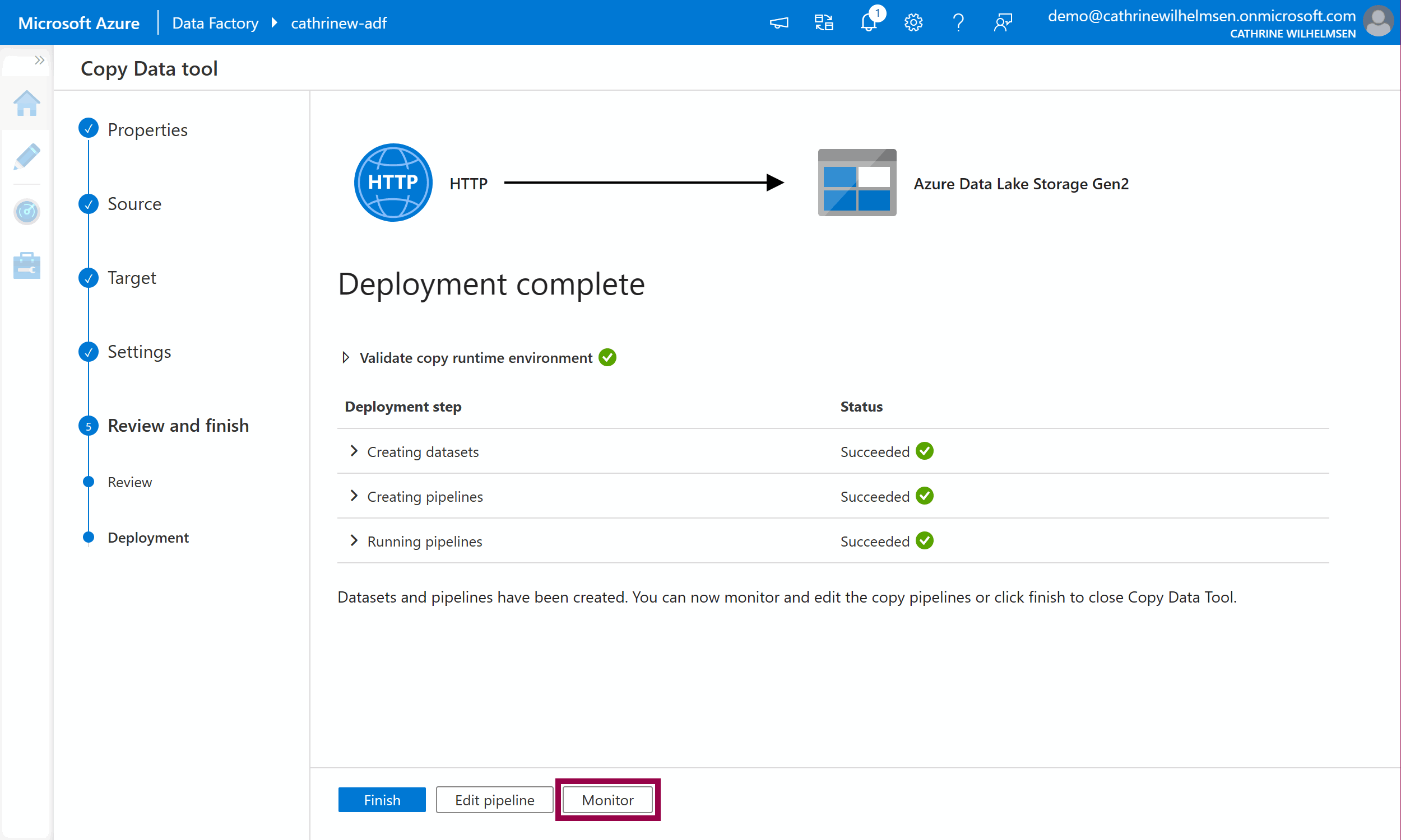 Once the deployment is complete, we can open the pipeline on the Author page, or view the execution on the Monitor page. Click monitor: