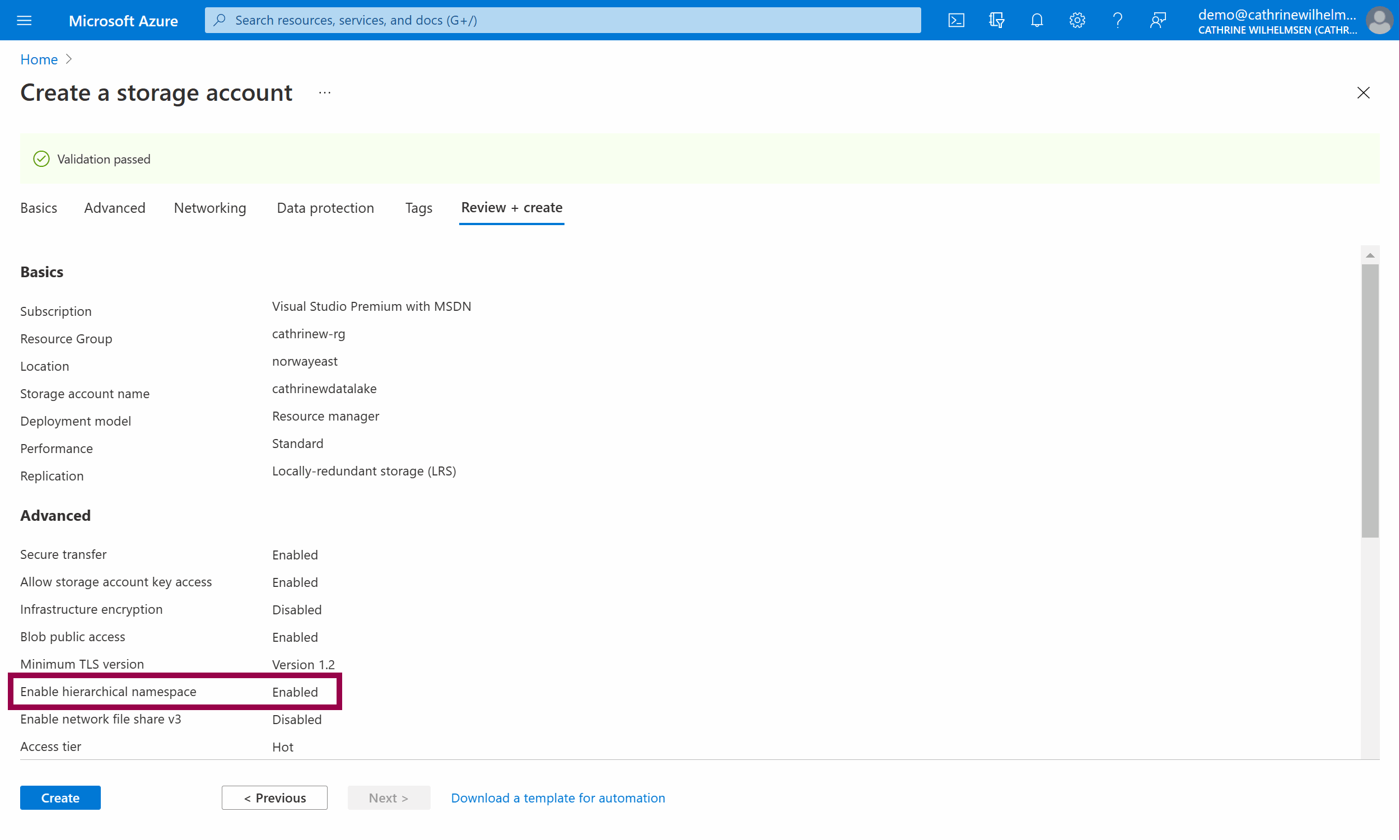 Under Advanced, under Data Lake Storage Gen2, select enable hierarchical namespace. This is what turns your storage account a data lake instead of a regular blob storage account.