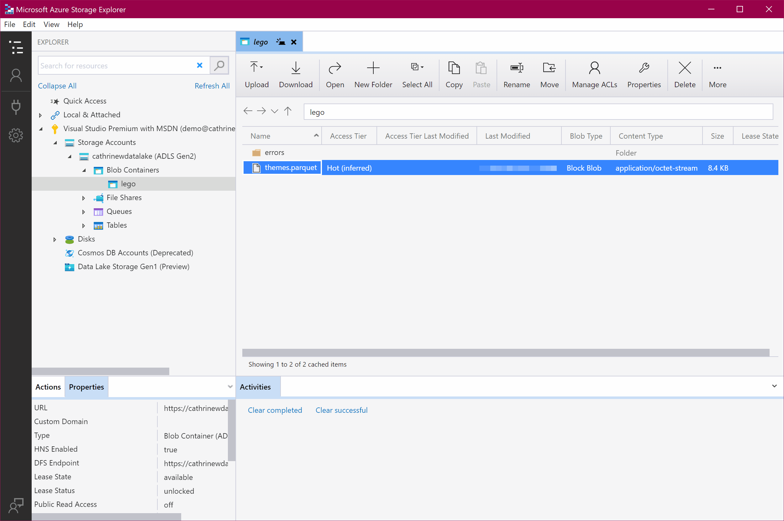 We can now open Azure Storage Explorer and verify that the gzipped CSV file from Rebrickable has been copied and converted to a parquet file in our data lake: