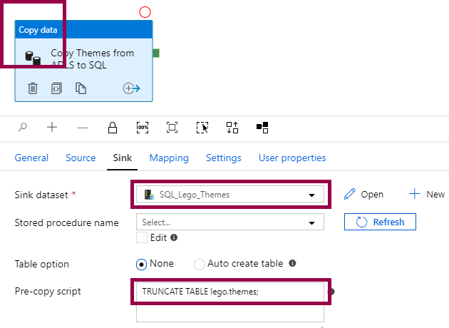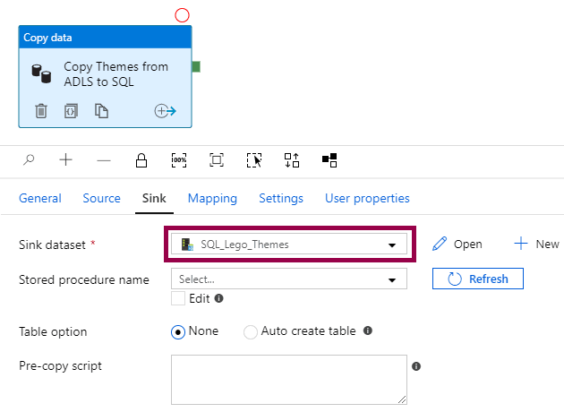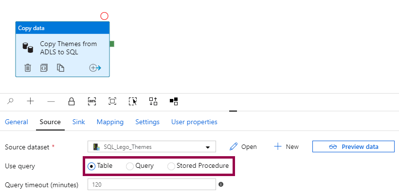 In this case, the dataset is only used as a bridge to the linked service, so we can call the stored procedure: