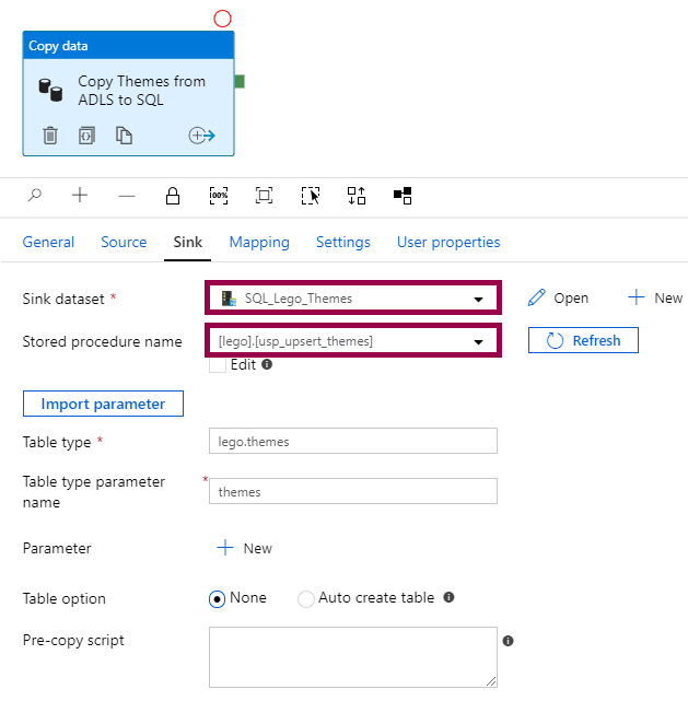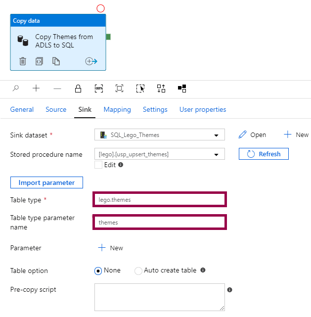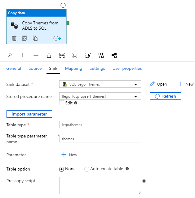 To load into a stored procedure, you specify the sink dataset, stored procedure name, table type, and table type parameter name: