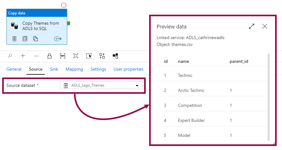 Because here’s the magic… The copy data activity reads the source data, maps the source data to the table type, and passes the table type into the stored procedure. The stored procedure then uses the data wrapped in the table type to insert and update the rows.