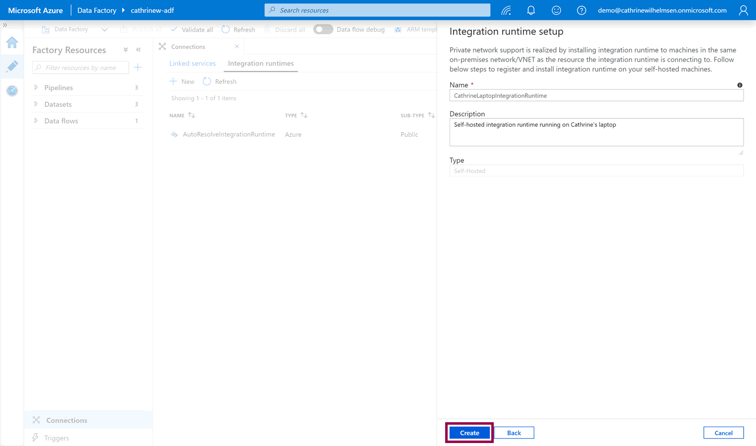 Give the new integration runtime a name and description, then click create: