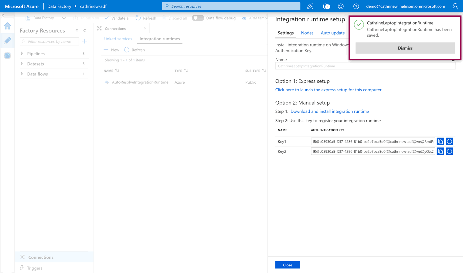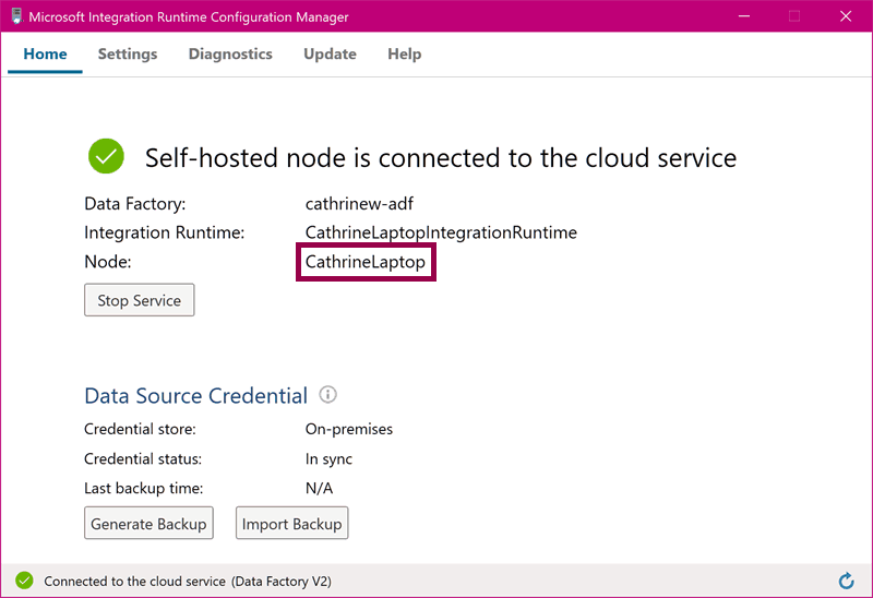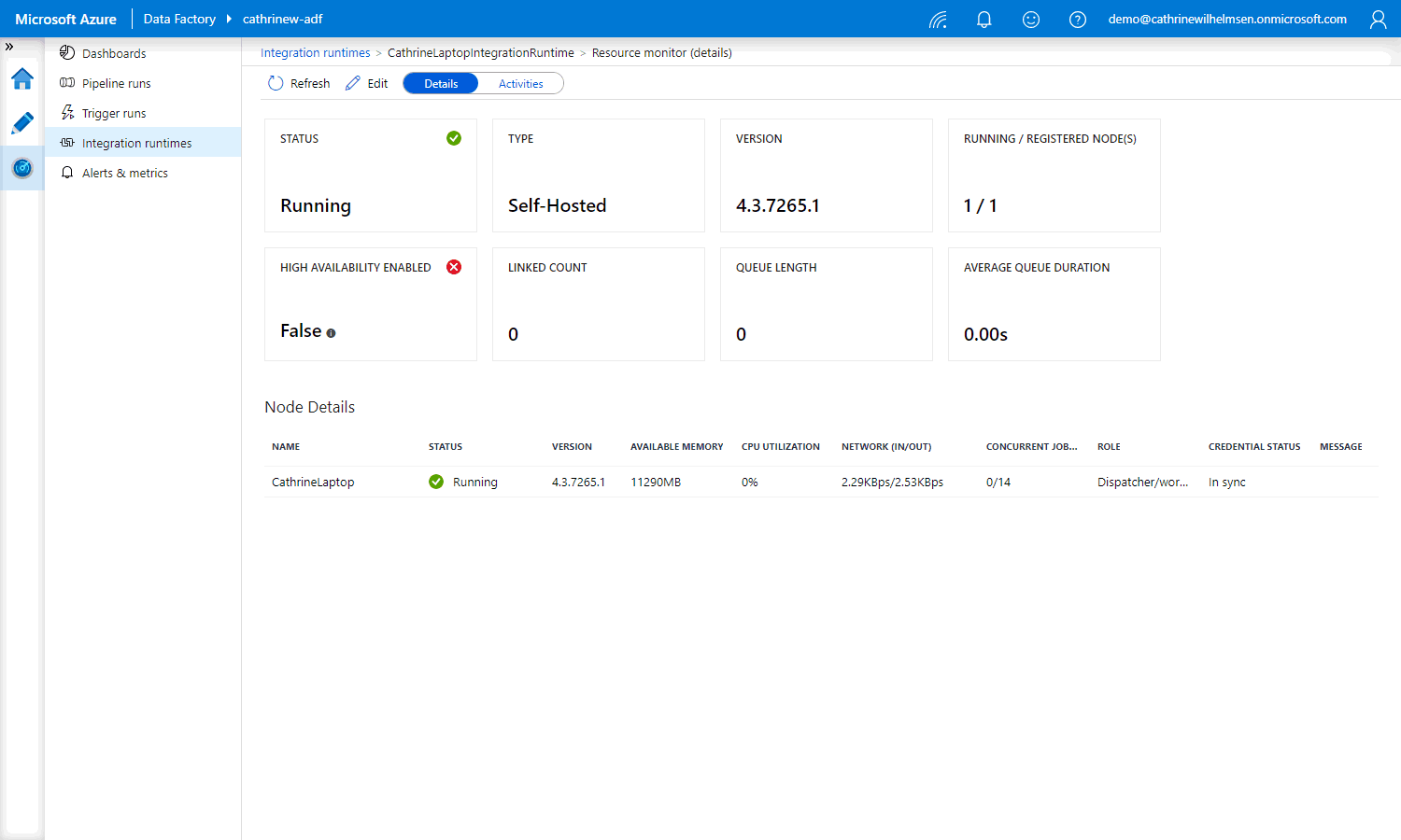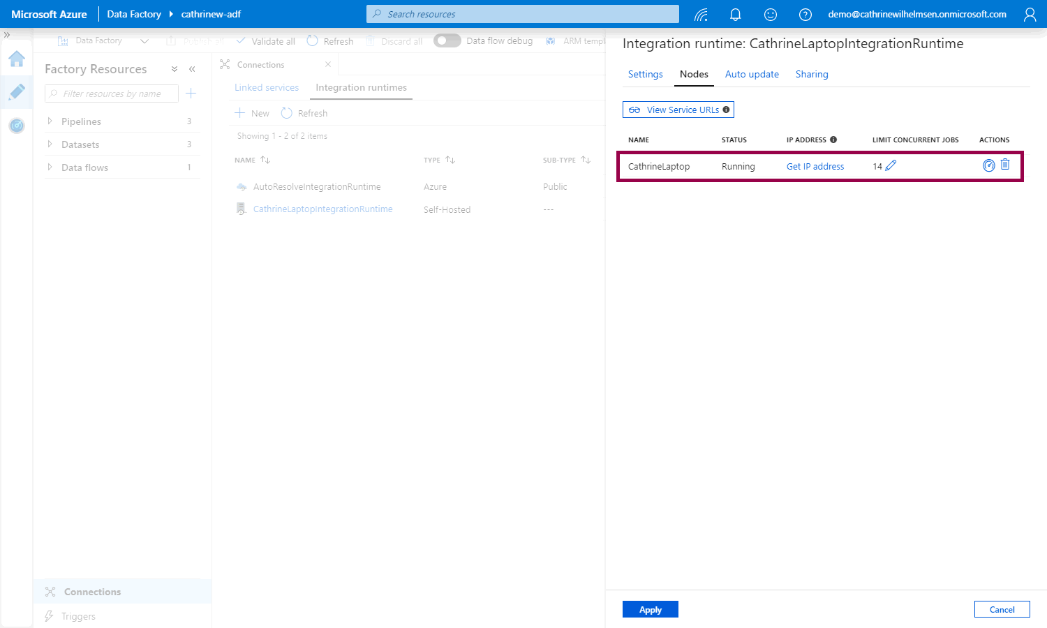 Back in the Azure Data Factory interface, under Nodes , we can see the new CathrineLaptop node that we just installed:
