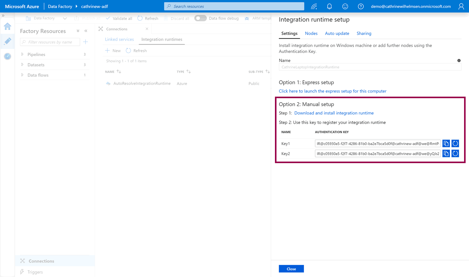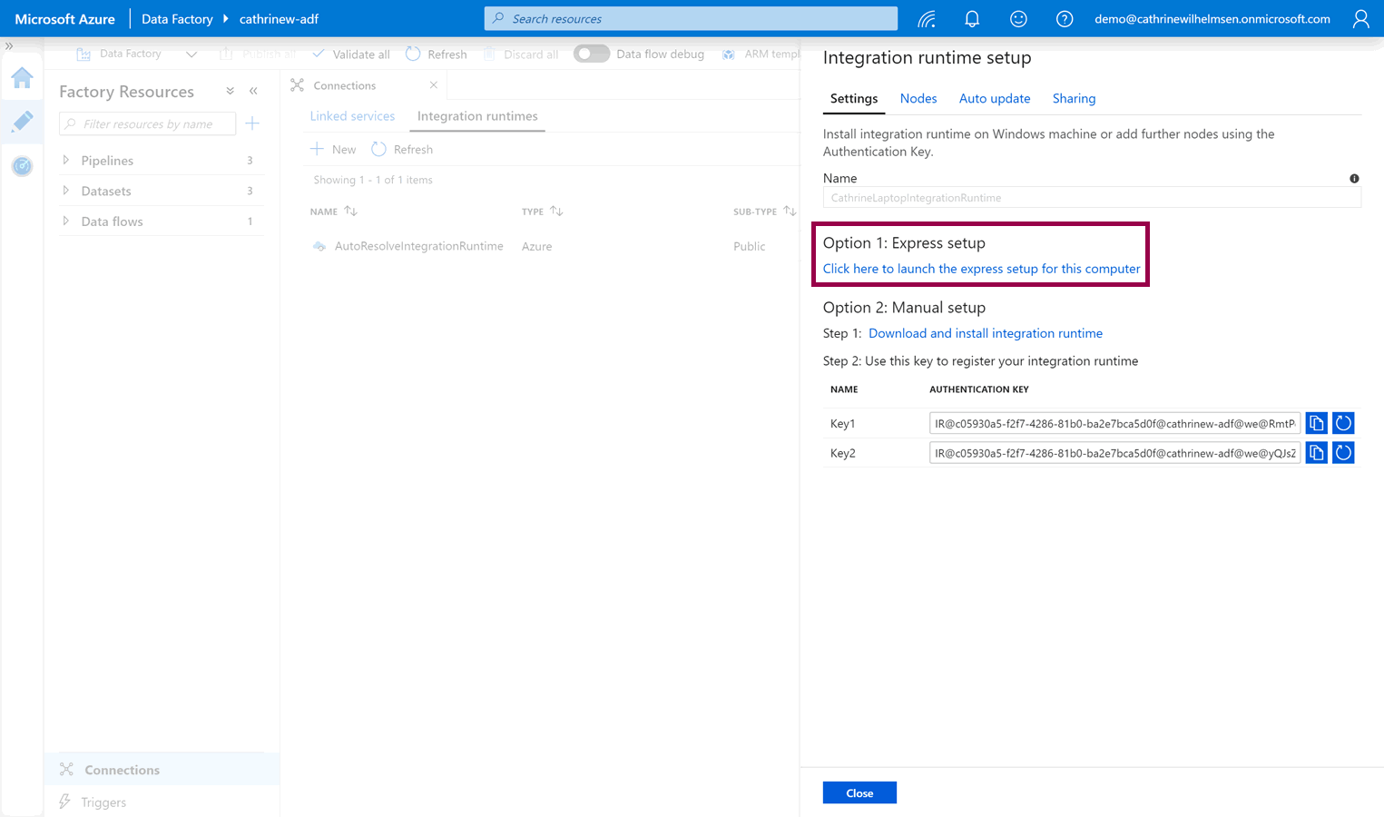 Next, you need to download the integration runtime installation file(s). If you are currently working from the computer you want to install the integration runtime on, you can choose option 1: express setup: