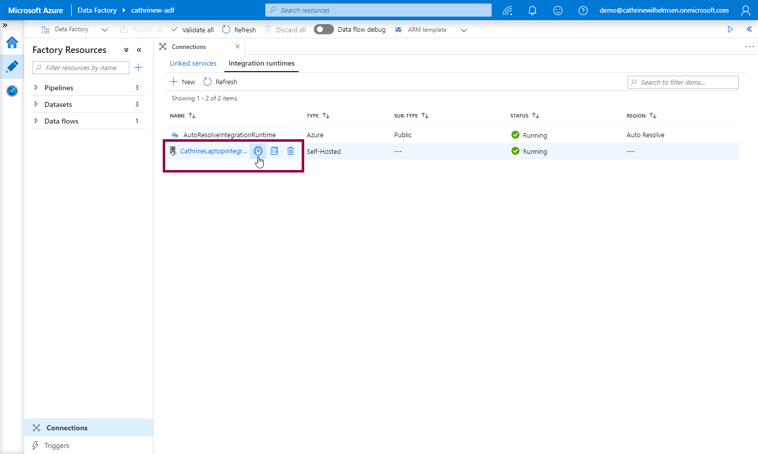 On the integration runtimes page, we can see that our new self-hosted integration runtime is running. Click on the monitor button for more details: