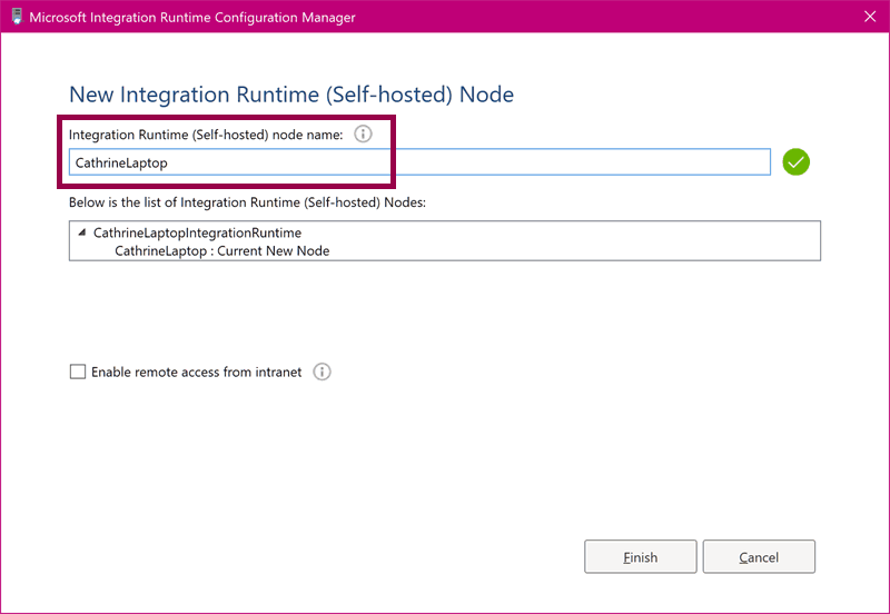 The integration runtime will use your chosen name as the node name: