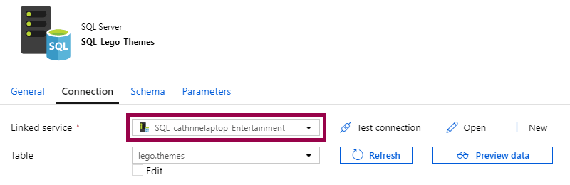 Then, create a new SQL Server dataset and connect via the new linked service: