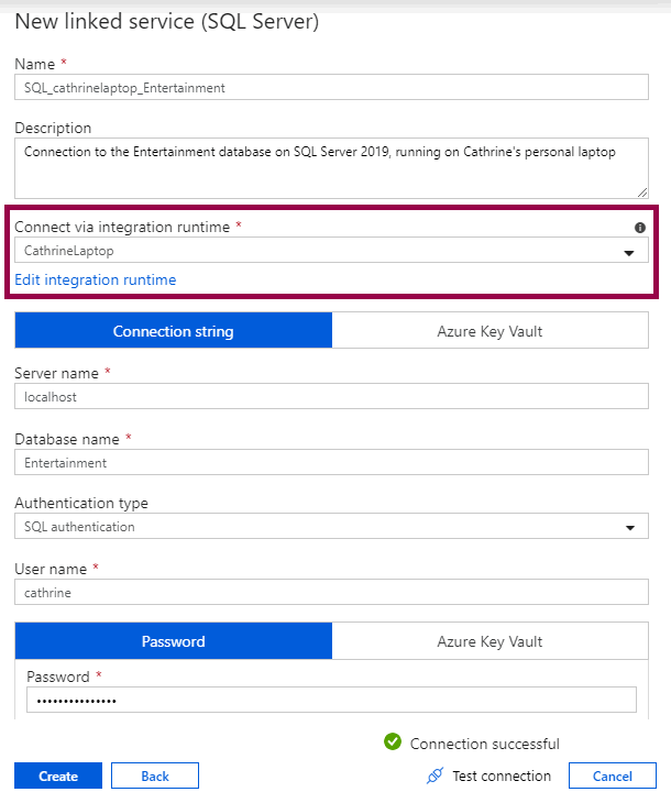Create a new SQL Server linked service and connect via the new self-hosted integration runtime: