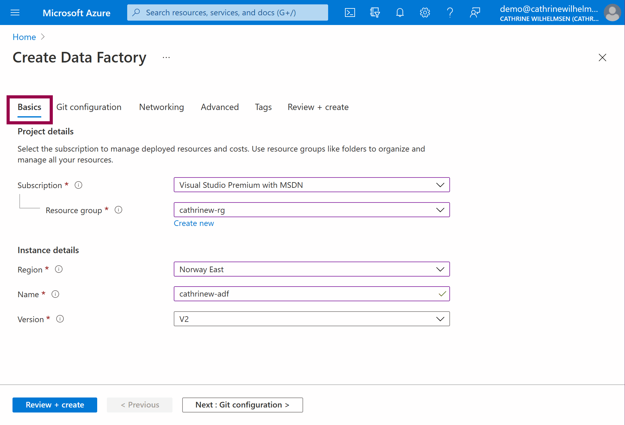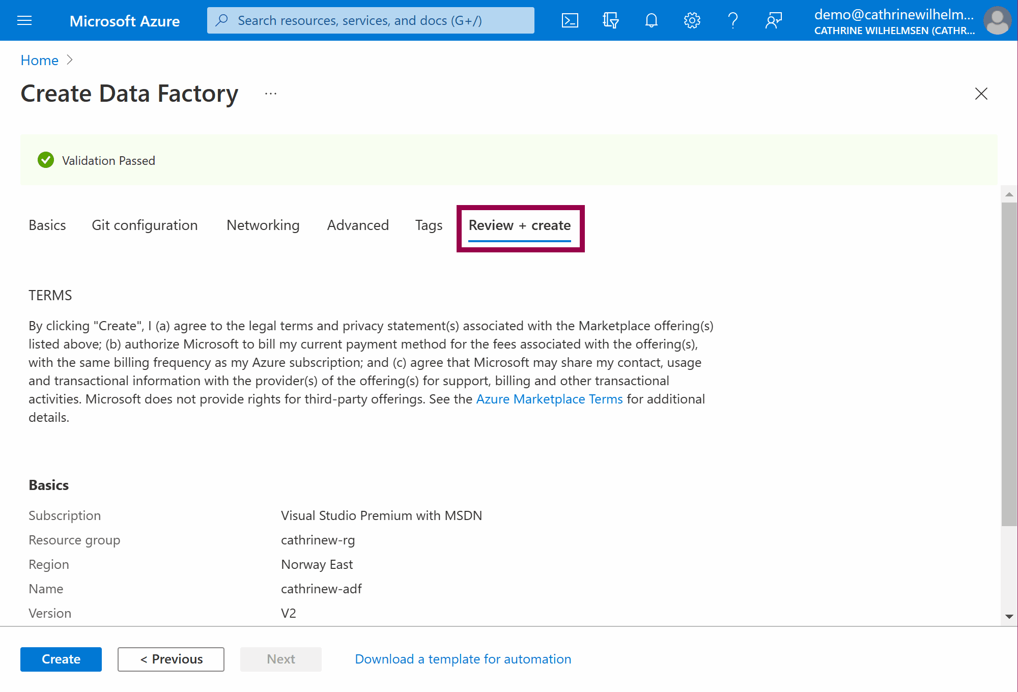 Choose the region closest to you where Azure Data Factory is generally available. I chose Norway East.