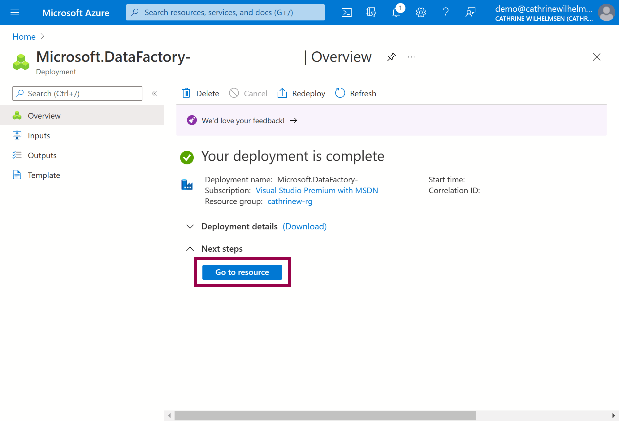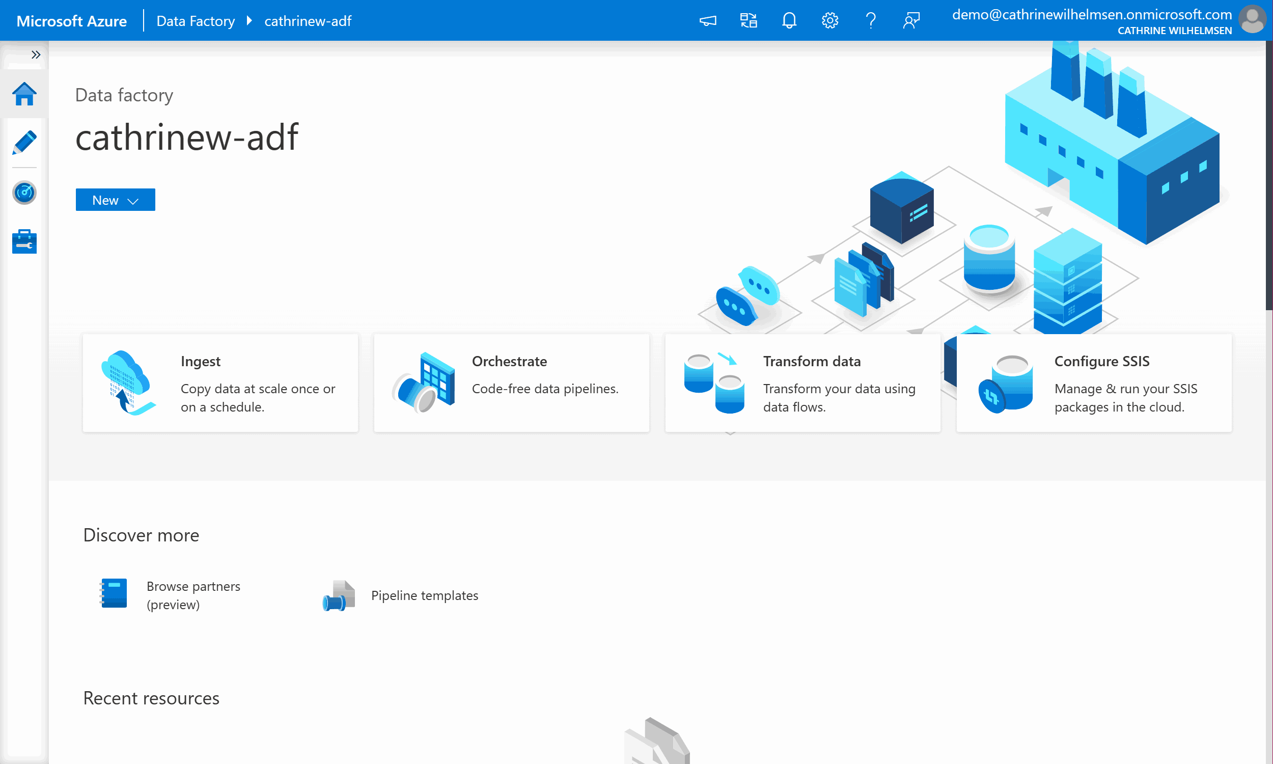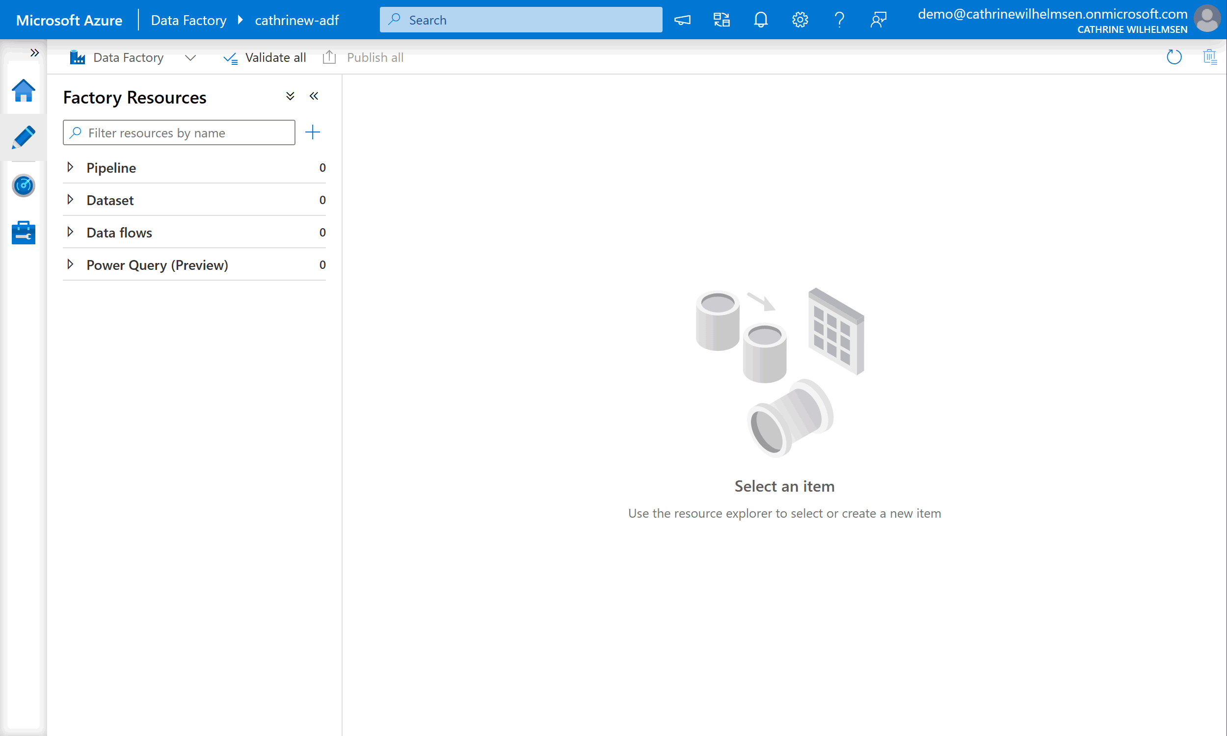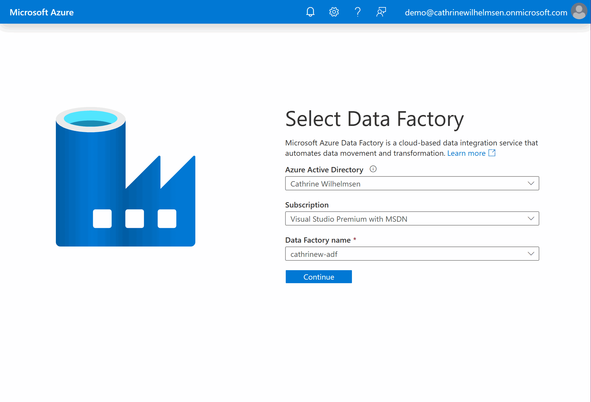 The name of your Azure Data Factory has to be unique across all of Azure. That means that you may have to try a few options before finding something that hasn’t already been taken. I can tell you right away that “adf” is unavailable. So is “asdfasdf” :) I used cathrinew-adf.