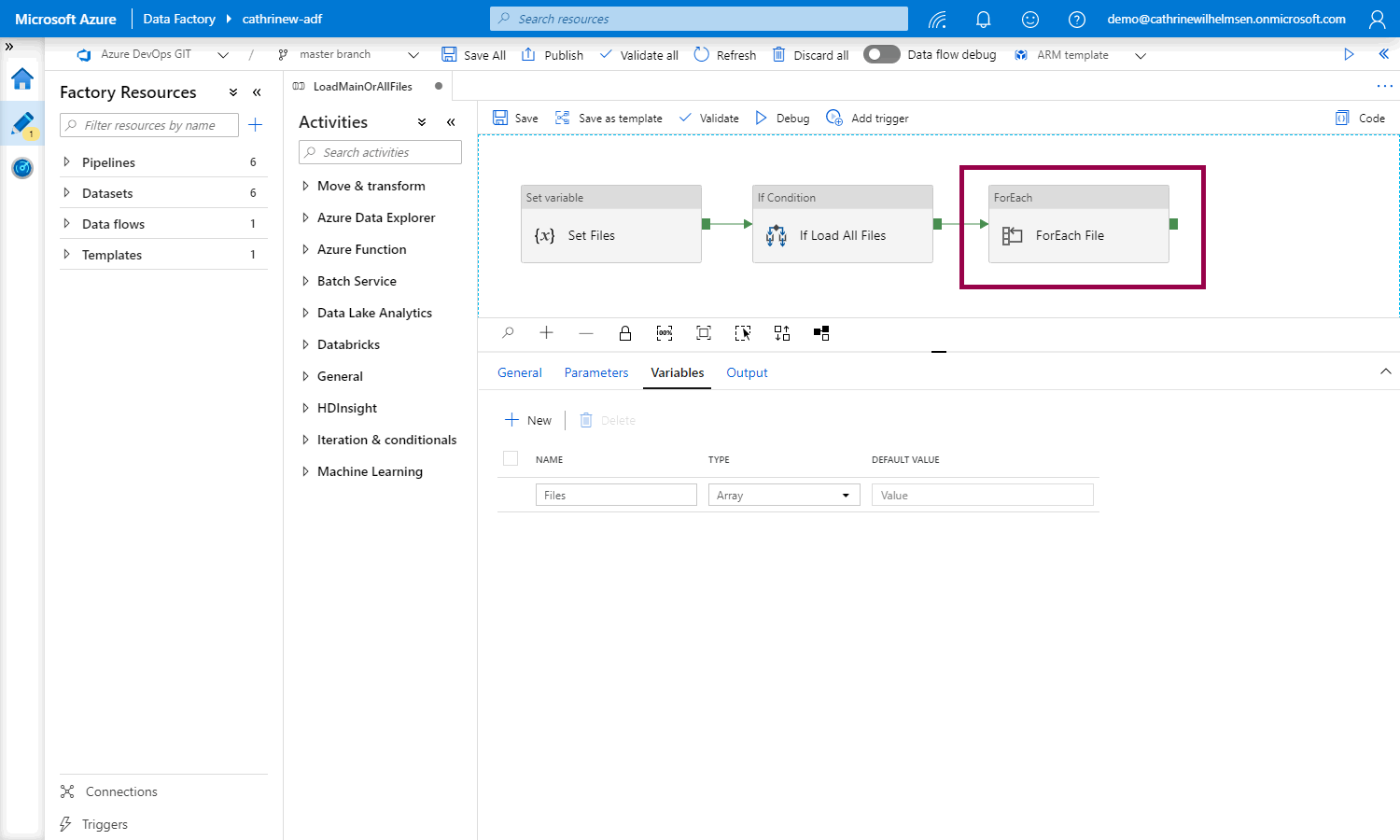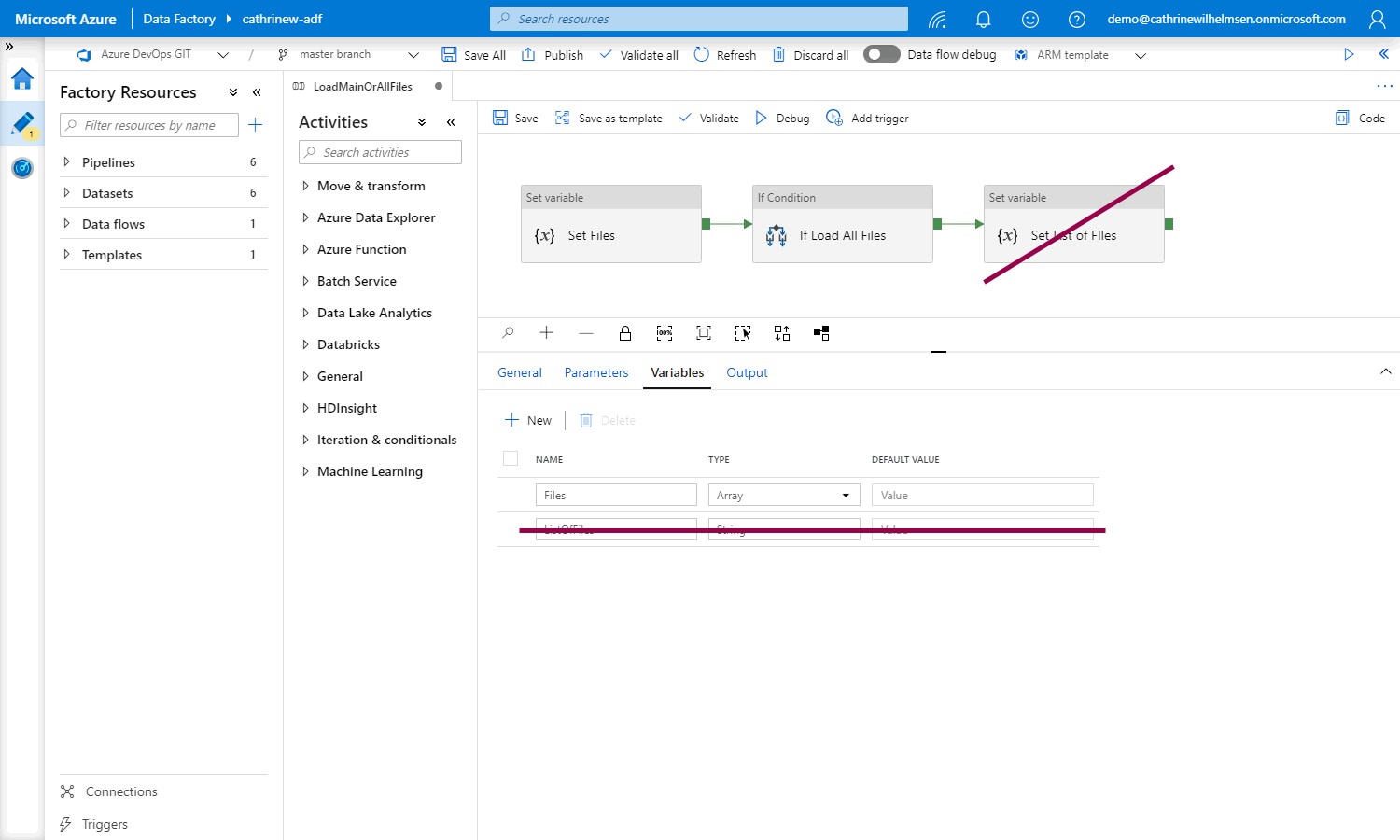 In the previous post about variables, we created a pipeline that set an array variable called Files. Let’s use this array in a slightly more useful way 😊 Delete the old Set List of Files activity and ListOfFiles variable: