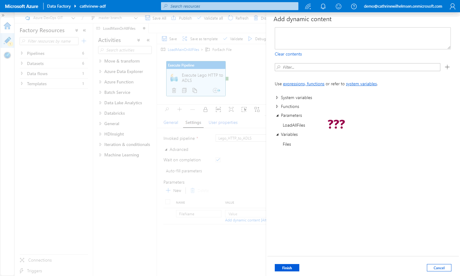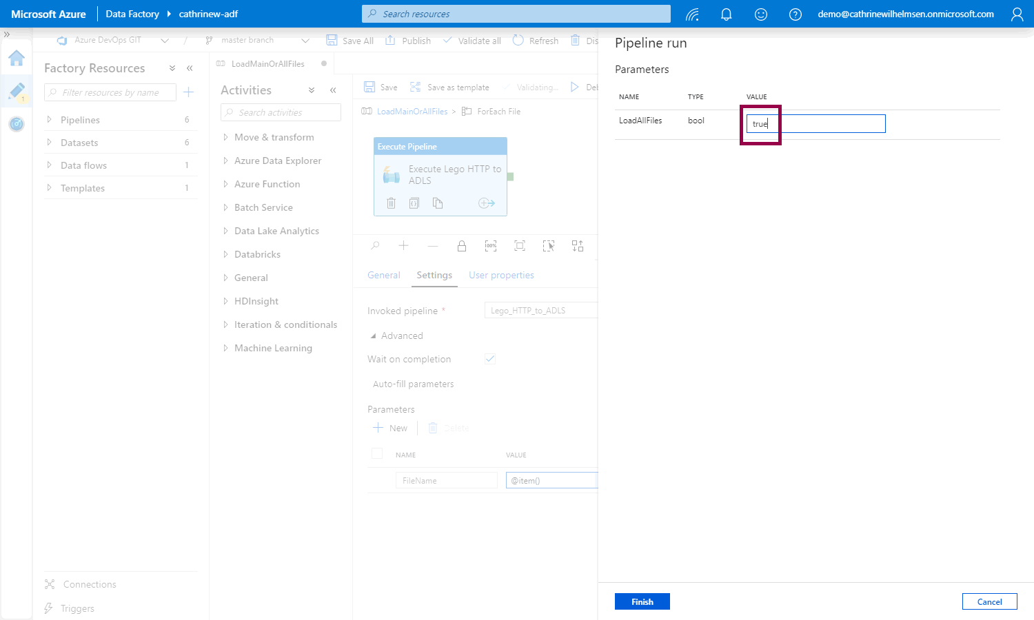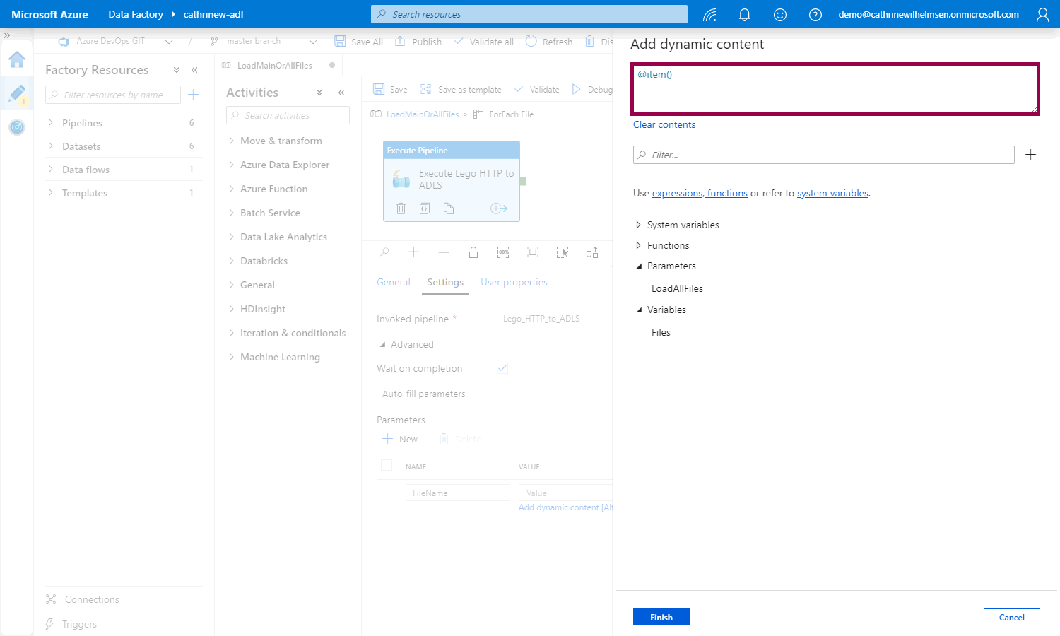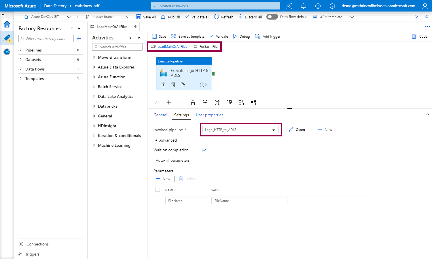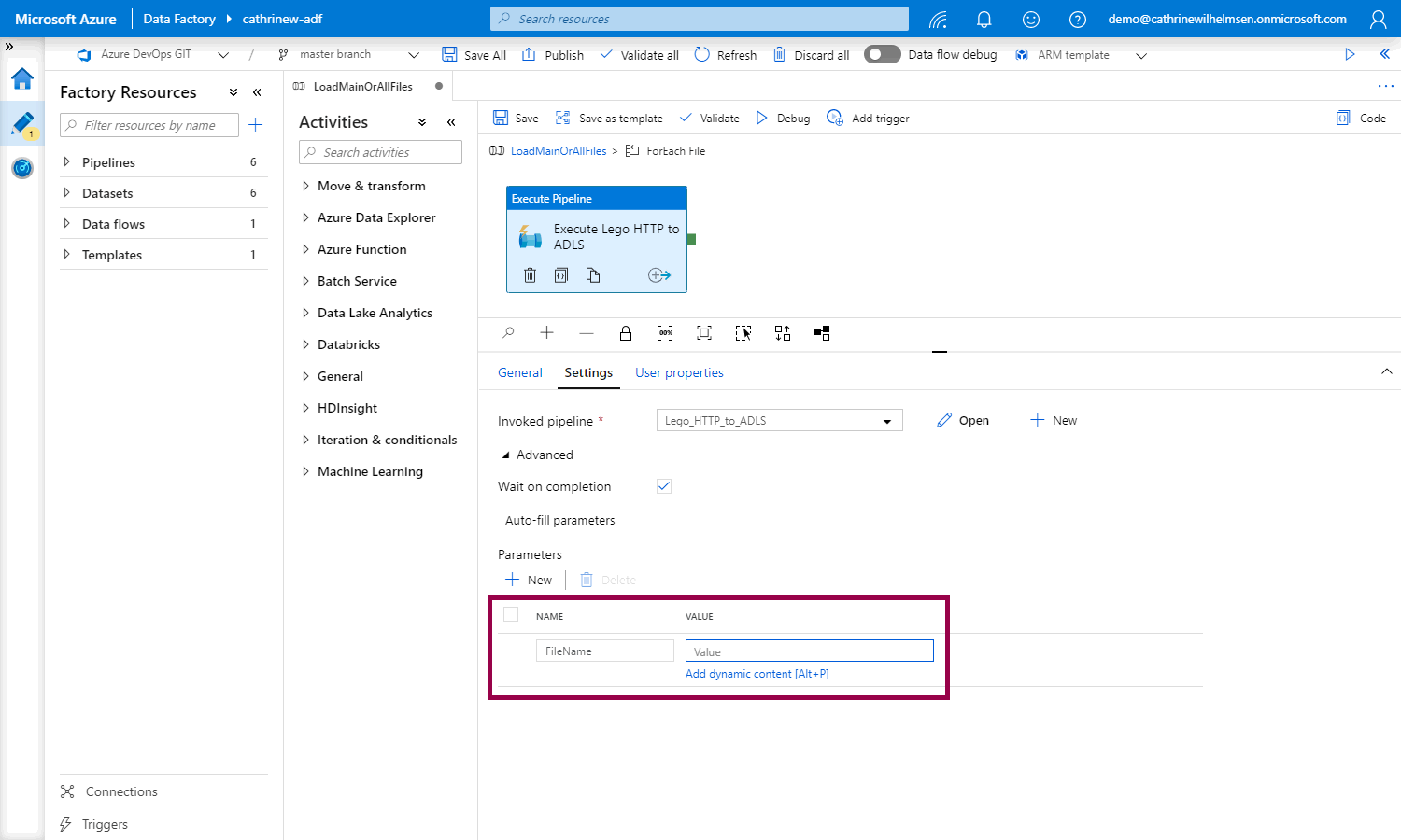 Now we need to pass the current value from the Files array as the FileName pipeline parameter: