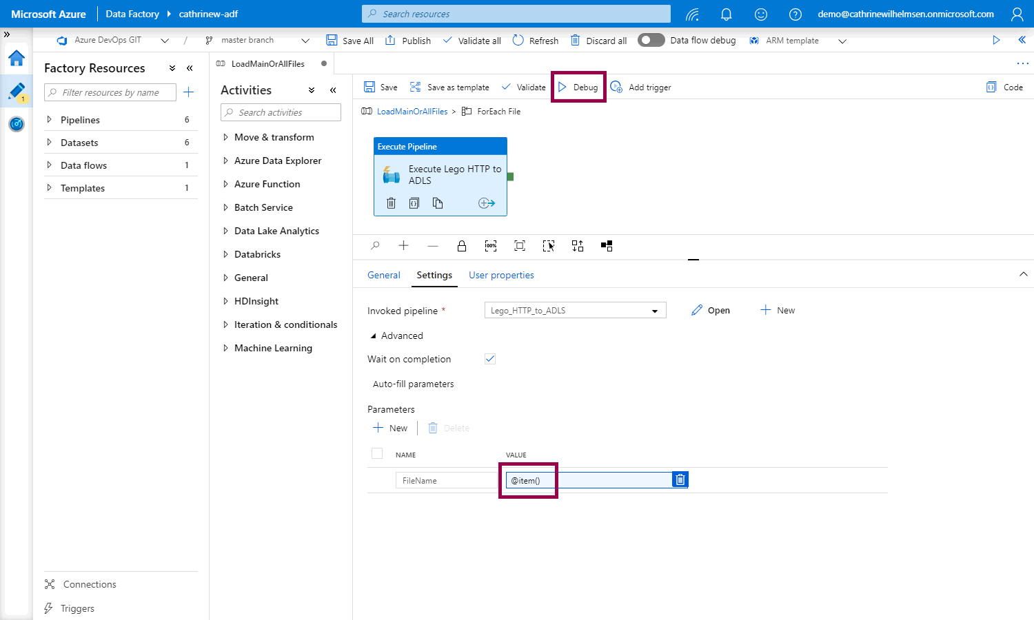 Now, our pipeline will set the Files array, then use the array to control the foreach loop. For each iteration of the loop, the filename will be passed as a parameter to the parameterized pipeline. Click debug:
