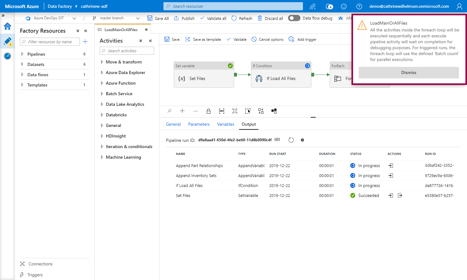 When we debug a foreach loop, we will get a warning saying that all activities will be executed sequentially. But don’t worry! It will run in parallel when you trigger it: