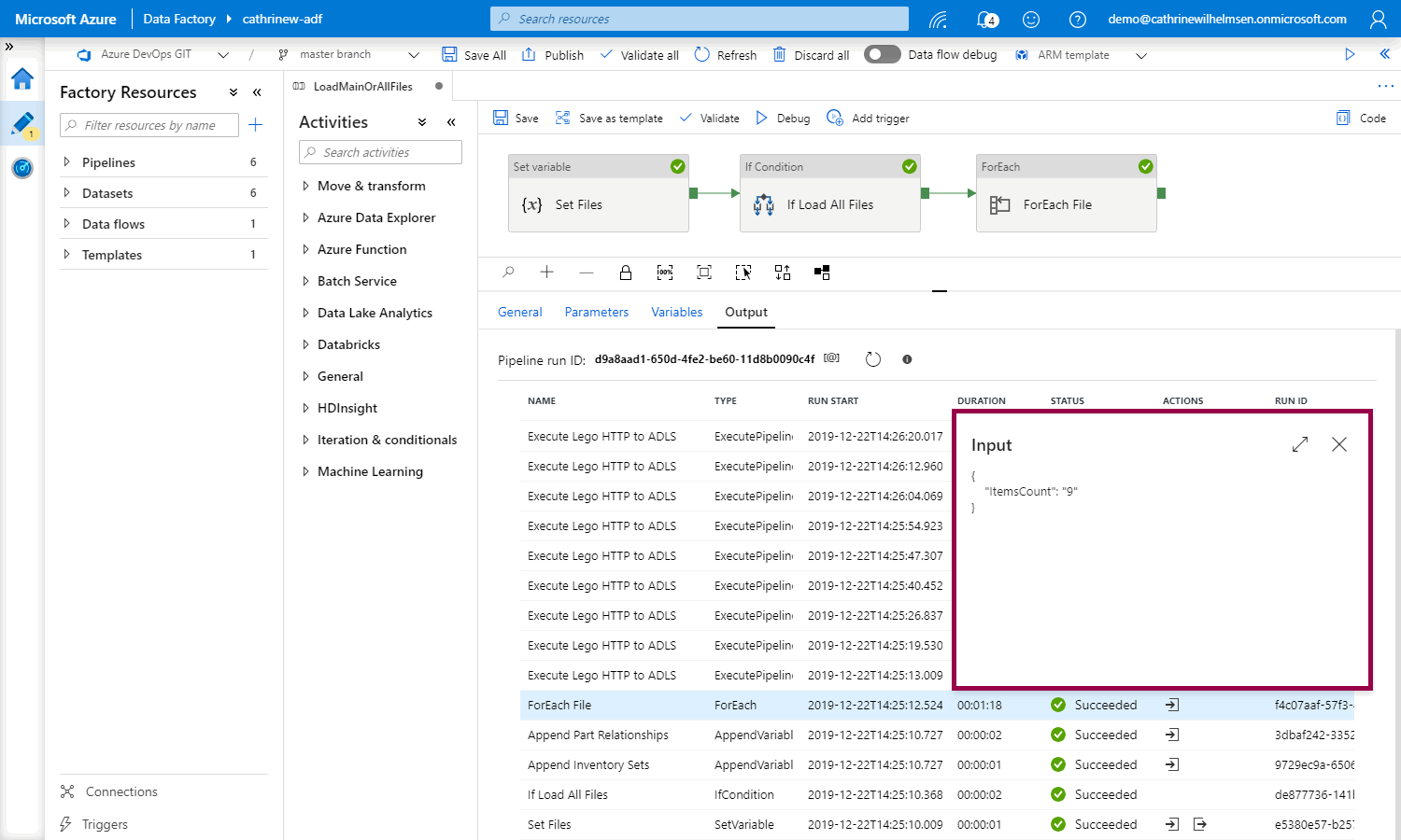 In the output, we will see that the foreach loop ran the execute pipeline activity nine times:
