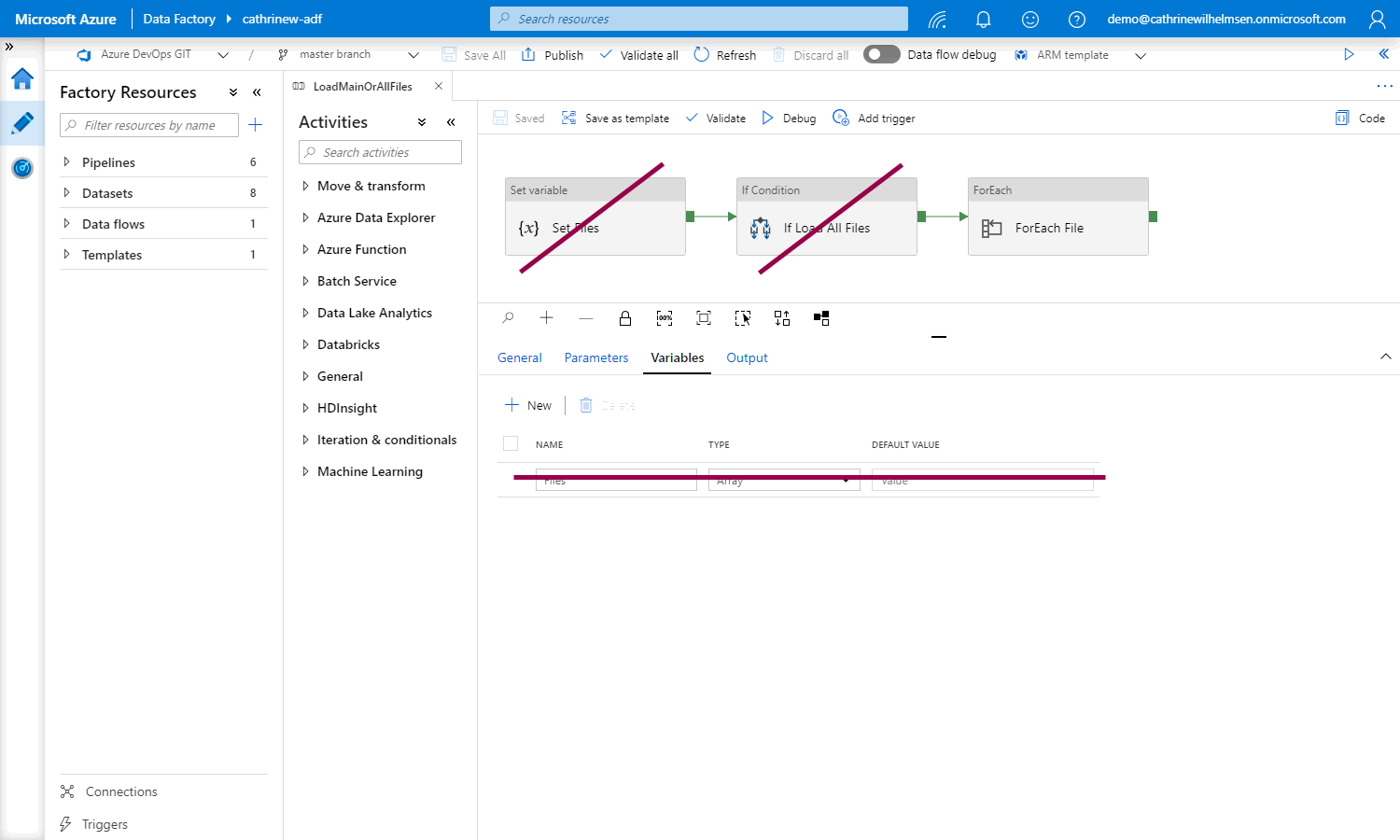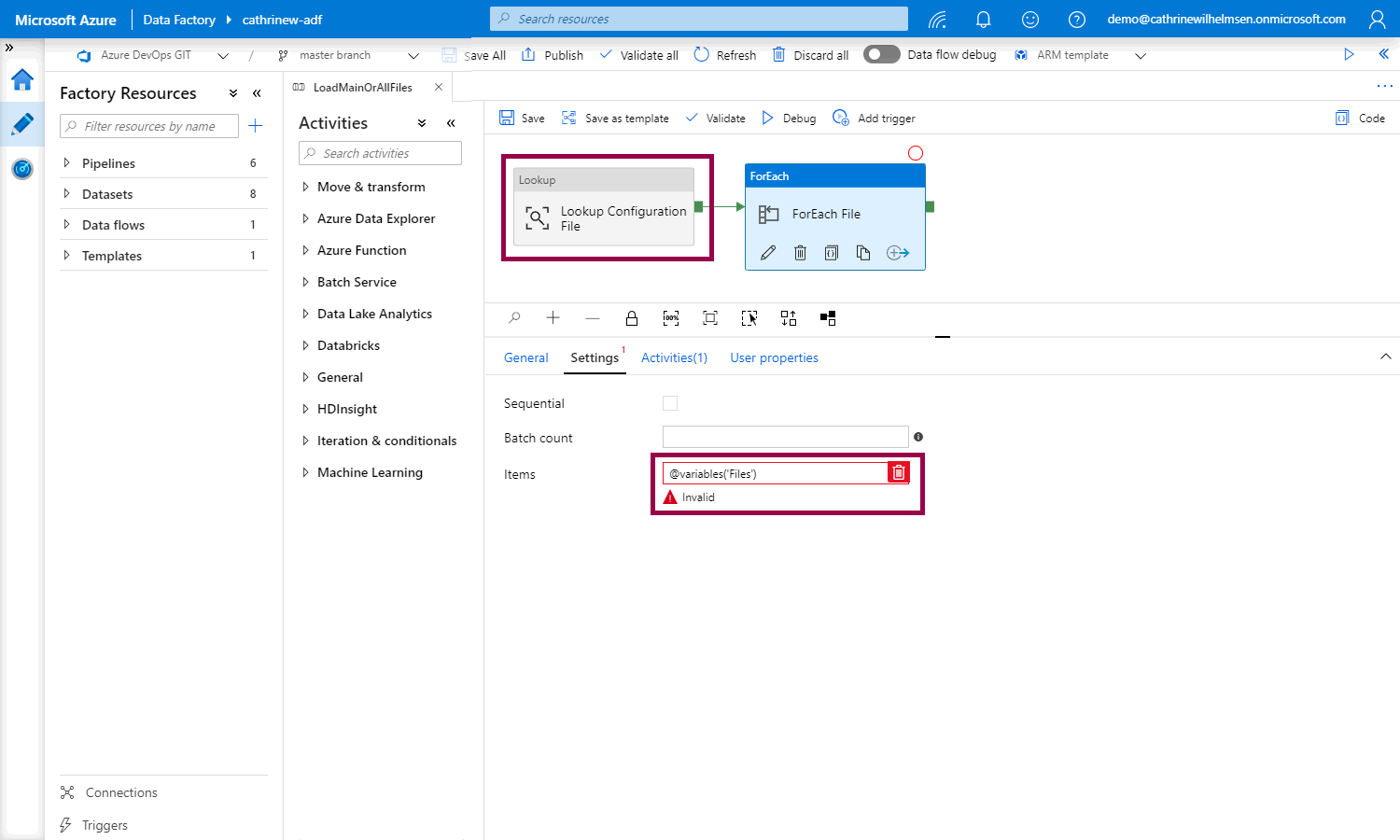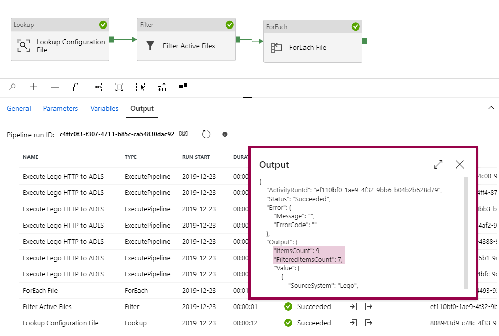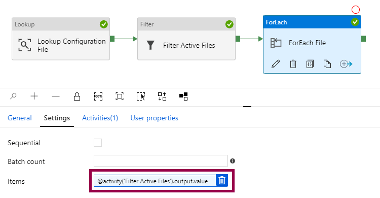 Then, we change the foreach loop to use @activity(‘Filter Active Files’).output.value: