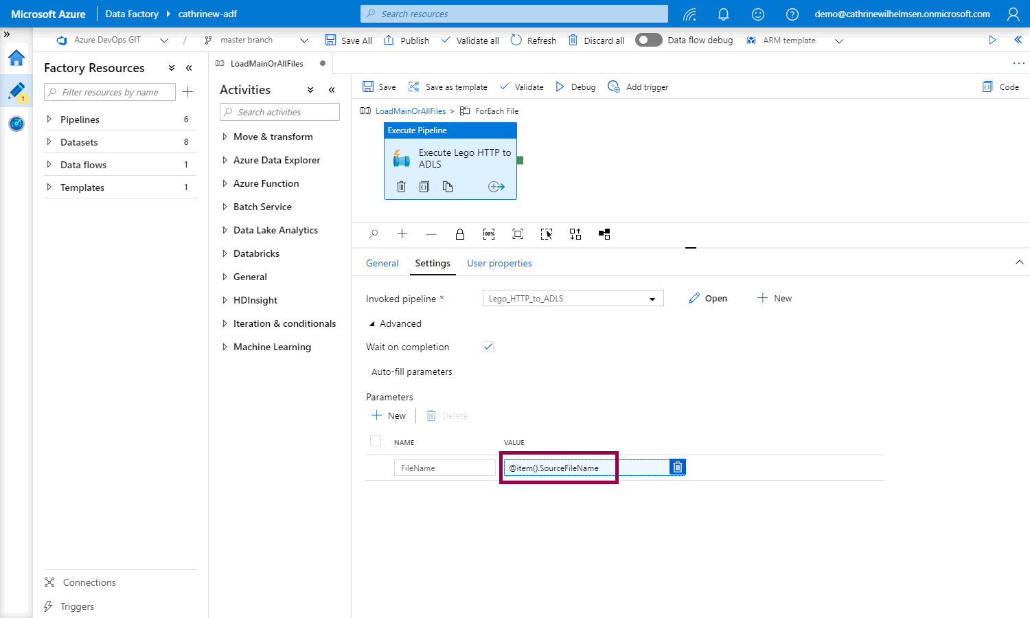 And then, inside the foreach loop, we need to change @item() to @item().SourceFileName, because we only want a to pass the file name as the parameter: