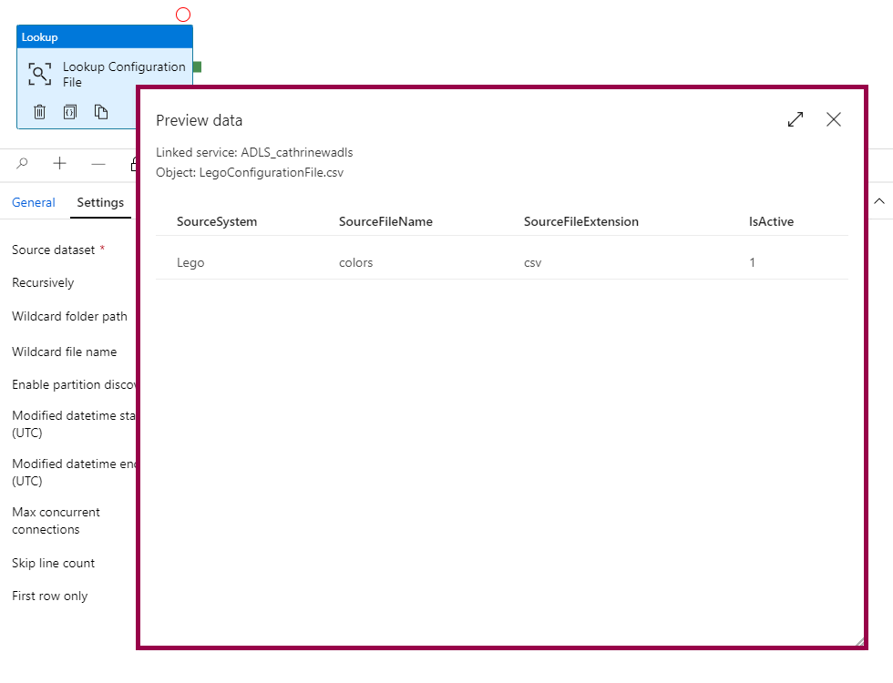 …and that’s what you will pass in as the file name parameter if you use the default value @activity(‘Lookup Configuration File’).output. That’s… not going to work very well 😄