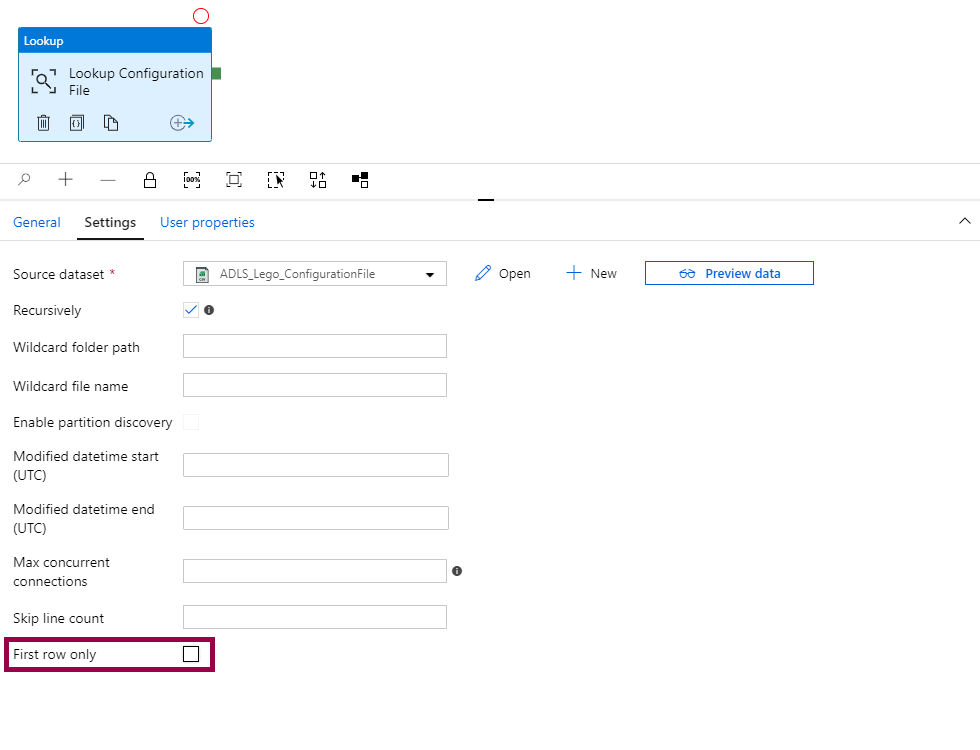 When we add a lookup activity and choose the new file dataset, we can choose to get the first row only: