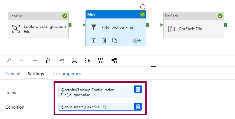 This time, we use @activity(‘Lookup Configuration File’).output.value as the filter items, and use the expression @equals(item().IsActive, ‘1’) as the filter condition.