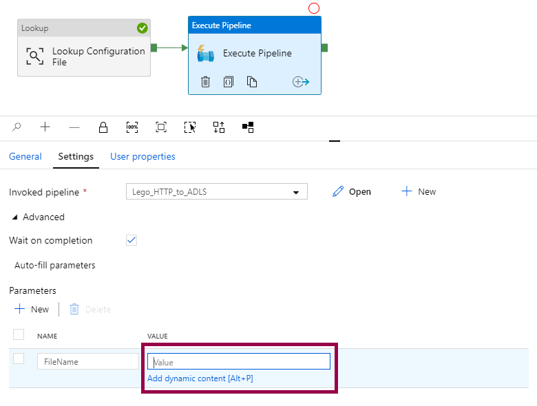 First, we use the lookup activity to get the first row only. Then, we add an execute pipeline activity. Now we want to pass the file name from the lookup activity to the execute pipeline parameter. Click add dynamic content: