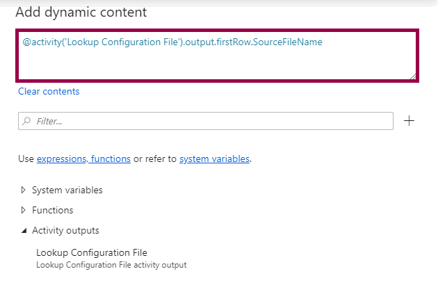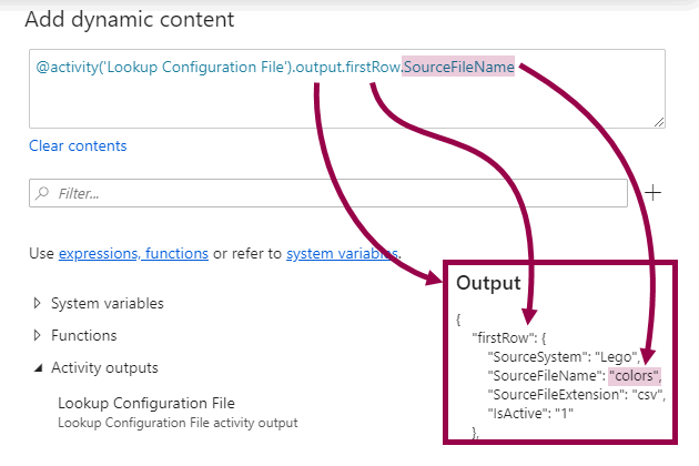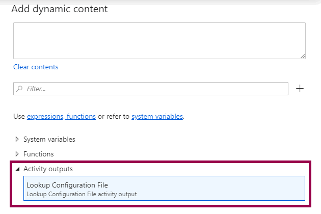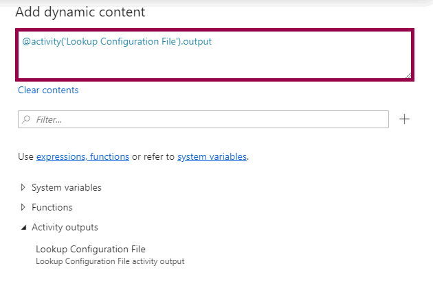 This adds @activity(‘Lookup Configuration File’).output to the dynamic content: