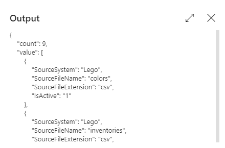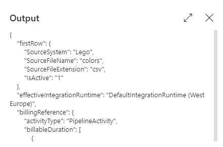 So far, so good! Except! Except that you probably don’t want to pass the entire output of the lookup activity as the file name parameter? 🤔 Remember the output screenshot a little further up? The JSON output looks like this:
