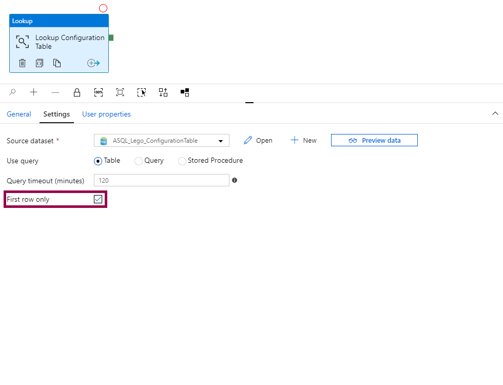 When we add a lookup activity and choose the new dataset, we can choose to get the first row only: