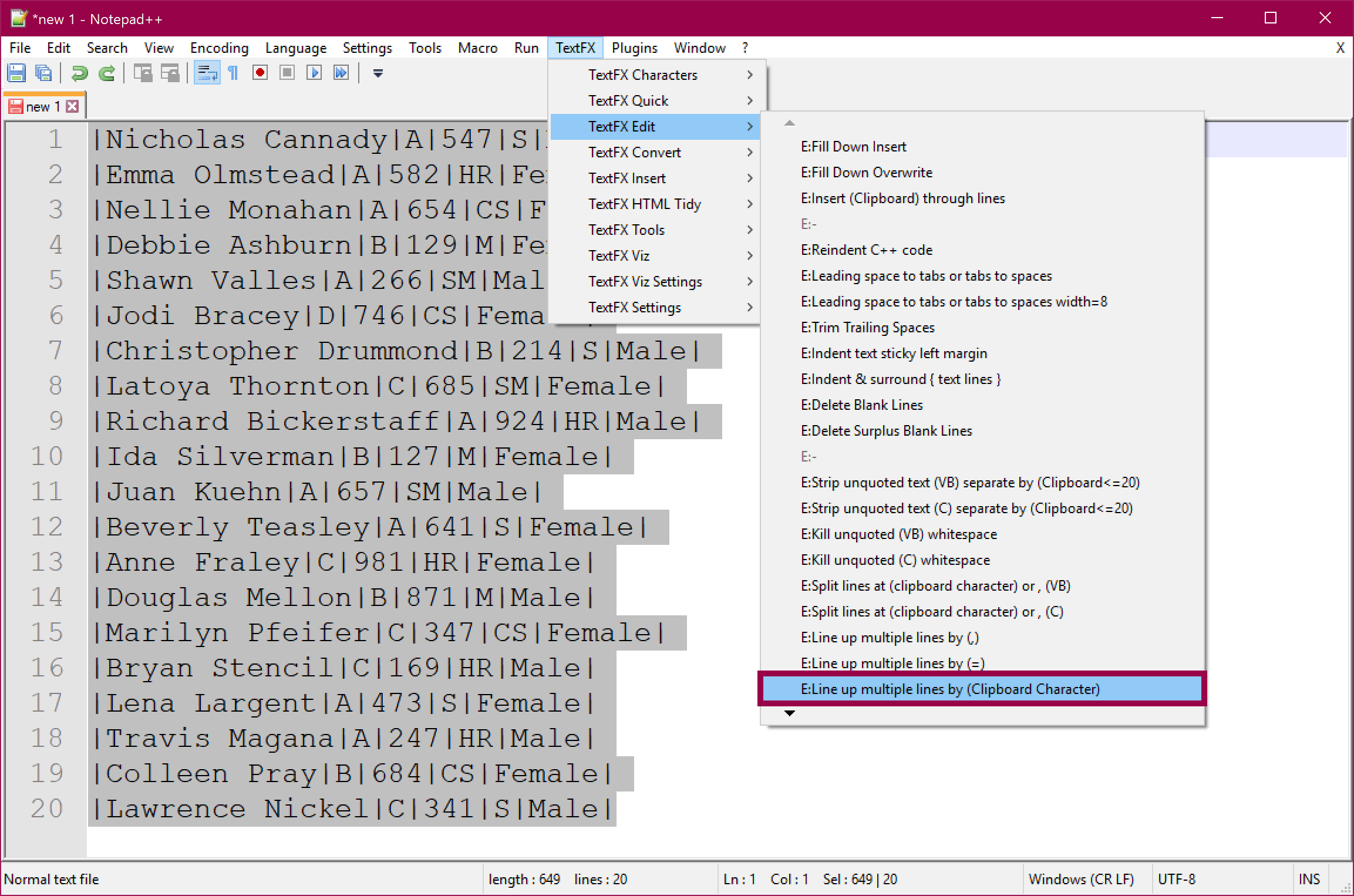 Do you not already have text formatted as columns? No problem! Quickly fix this first by using the Line up multiple lines by (Clipboard Character) option in the TextFX plugin.