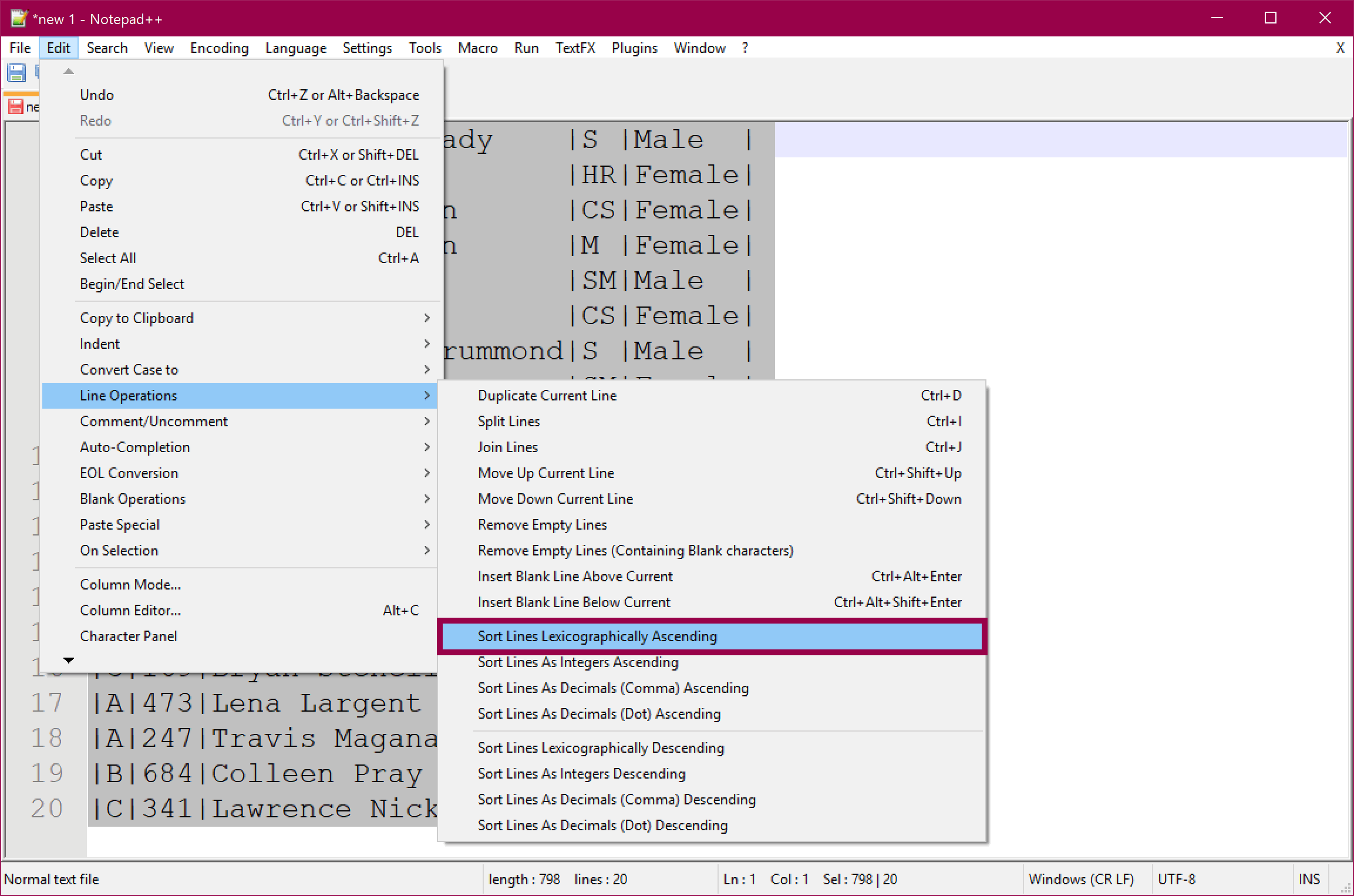 6. Select all the text, click Edit → Line Operations → Sort Lines Lexicographically Ascending: