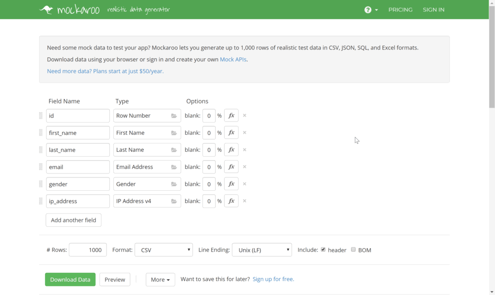 When I need to quickly create smaller sets of test data or dummy data, I use Mockaroo. It is highly configurable with over 140 built-in field types for locations, personal information, product information, technical information and much more. Every field type can be customized, and you can also use your own regular expression to generate data. The data can then be exported to CSV, JSON, SQL, and Excel formats. The interface is simple to use and understand, and you can save your schemas and data sets for later reuse.