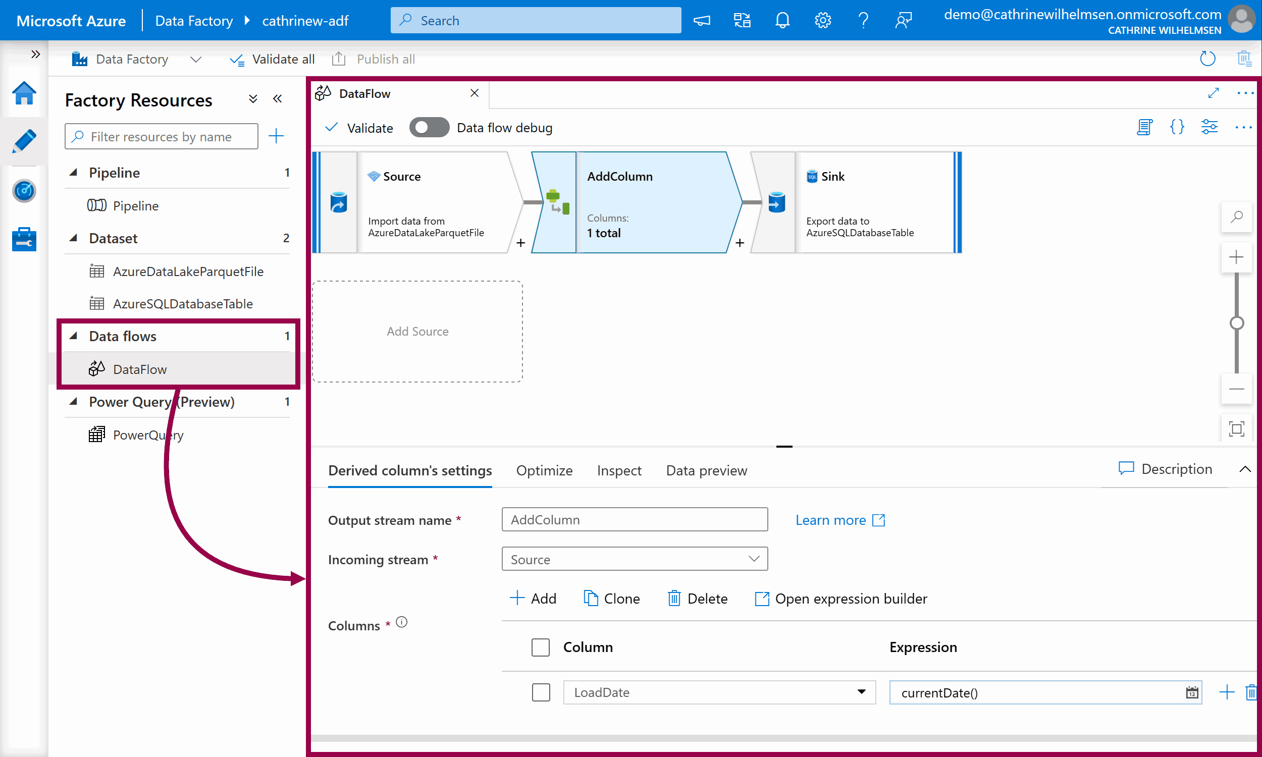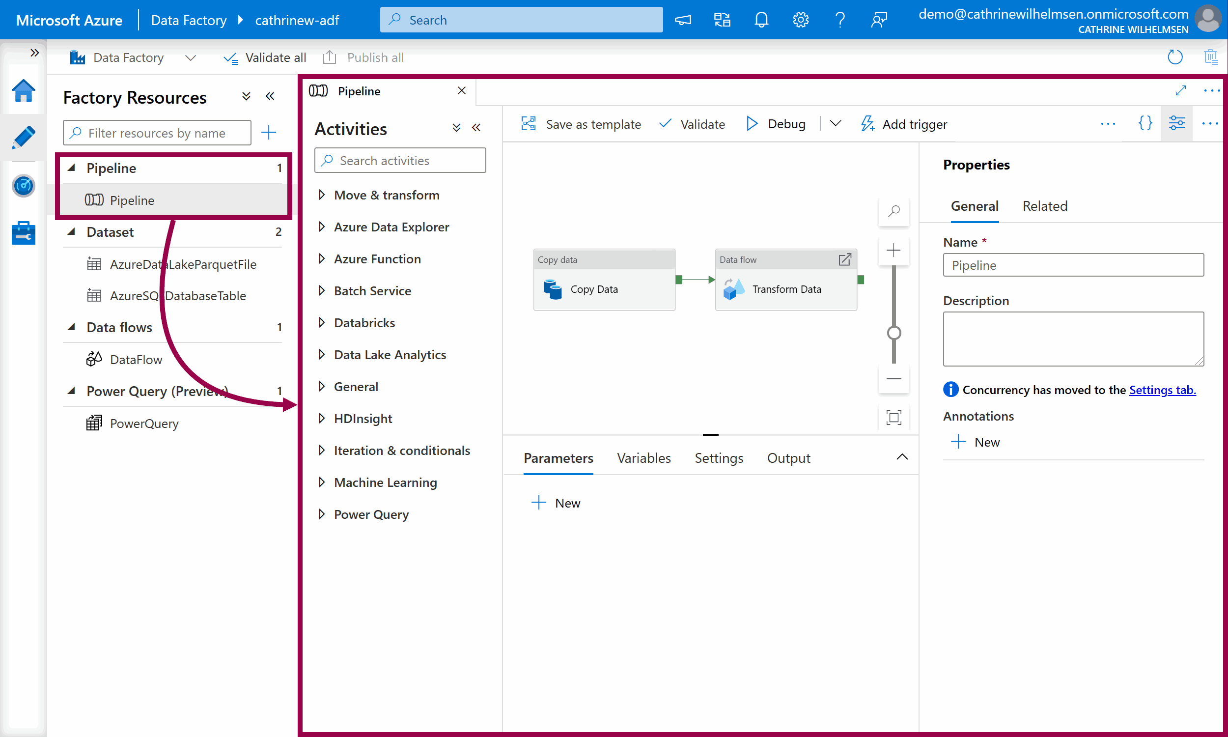 On the left side of the Author page, you will see your factory resources. In this example, we have already created one pipeline, two datasets, one data flow, and one power query:
