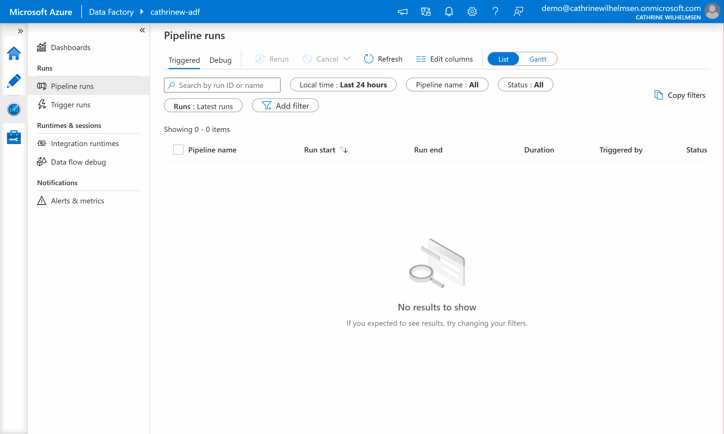 From here, you can view the overview dashboard, monitor your pipeline and trigger runs, view runtimes and sessions, and set up alerts.