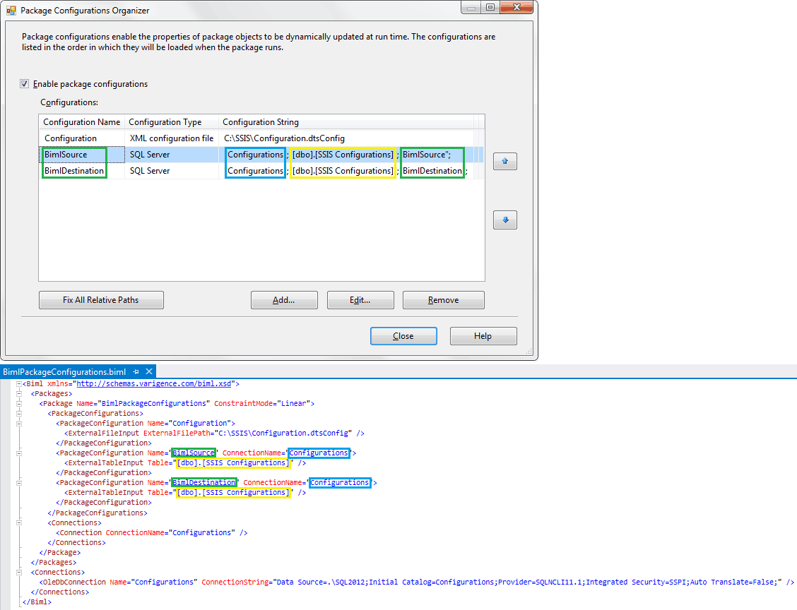 In SSIS I would open Package Configurations Organizer (SSIS → Package Configurations / right-click in Control Flow → Package Configurations), click add, choose the SQL Server configuration type, choose the Configurations connection, choose the [dbo].[SSIS Configurations] table, choose the BimlSource filter, click Next, click Reuse Existing, call it BimlSource, click Finish, repeat all the steps for BimlDestination and click Close: