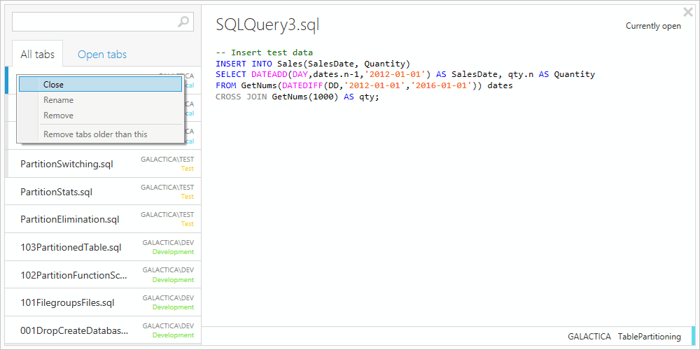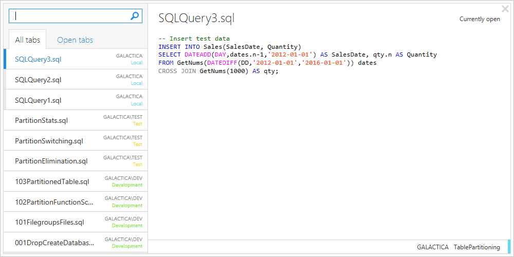 On the left side is the search box and the All tabs and Open tabs lists. The tabs are sorted in the order they were closed, with open tabs on the top of the list and the oldest closed tabs on the bottom of the list. Open tabs have a thick left border to separate them from closed tabs, and the currently selected tab is blue. Each tab shows information about which server it is connected to with the environments and environment colors defined in Redgate SQL Prompt Tab Colors.