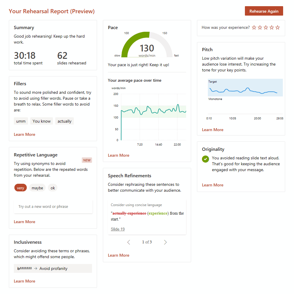 The report shows you details about the total time spent, your pace and pitch over time, whether or not you are simply reading from your slides, as well as actionable feedback on your language. The feedback includes whether you are using too many filler words (like umm, actually, or you know), whether you are using too many repetitive words with alternatives you can use instead, whether you are using any words that can be offensive, and specific sentences that you can refine.